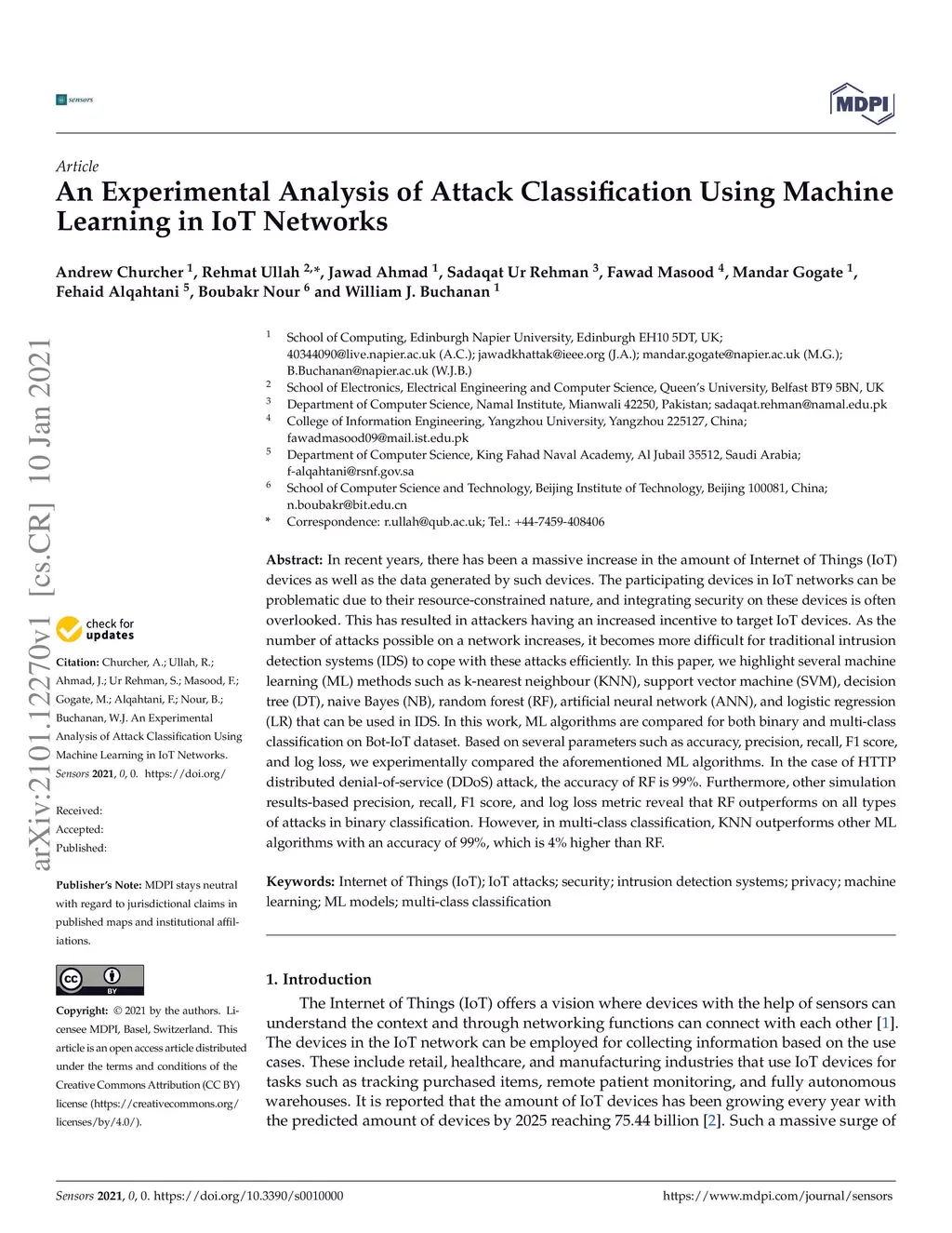 In recent years, there has been a massive increase in the amount of Internet of Things (IoT) devices as well as the data generated by such devices. The participating devices in IoT networks can be problematic due to their resource-constrained nature, and integrating security on these devices is often overlooked. This has resulted in attackers having an increased incentive to target IoT devices. As the number of attacks possible on a network increases, it becomes more difficult for traditional intrusion detection systems (IDS) to cope with these attacks efficiently. In this paper, we highlight several machine learning (ML) methods such as k-nearest neighbour (KNN), support vector machine (SVM), decision tree (DT), naive Bayes (NB), random forest (RF), artificial neural network (ANN), and logistic regression (LR) that can be used in IDS. In this work, ML algorithms are compared for both binary and multi-class classification on Bot-IoT dataset. Based on several parameters such as accuracy, precision, recall, F1 score, and log loss, we experimentally compared the aforementioned ML algorithms. In the case of HTTP distributed denial-of-service (DDoS) attack, the accuracy of RF is 99%. Furthermore, other simulation results-based precision, recall, F1 score, and log loss metric reveal that RF outperforms on all types of attacks in binary classification. However, in multi-class classification, KNN outperforms other ML algorithms with an accuracy of 99%, which is 4% higher than RF.