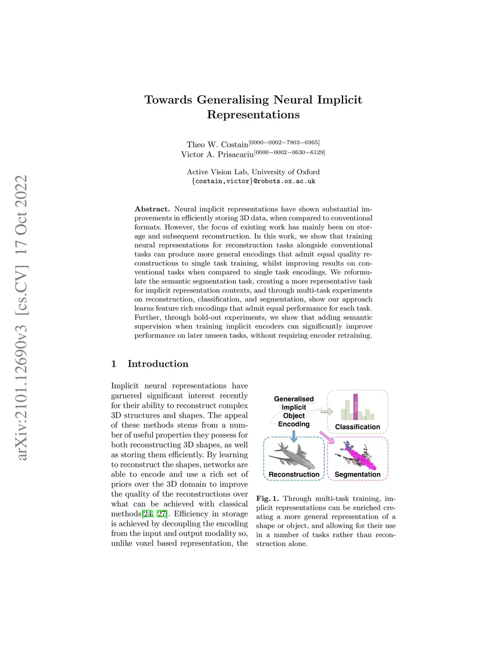 Neural implicit representations have shown substantial improvements in efficiently storing 3D data, when compared to conventional formats. However, the focus of existing work has mainly been on storage and subsequent reconstruction. In this work, we show that training neural representations for reconstruction tasks alongside conventional tasks can produce more general encodings that admit equal quality reconstructions to single task training, whilst improving results on conventional tasks when compared to single task encodings. We reformulate the semantic segmentation task, creating a more representative task for implicit representation contexts, and through multi-task experiments on reconstruction, classification, and segmentation, show our approach learns feature rich encodings that admit equal performance for each task.