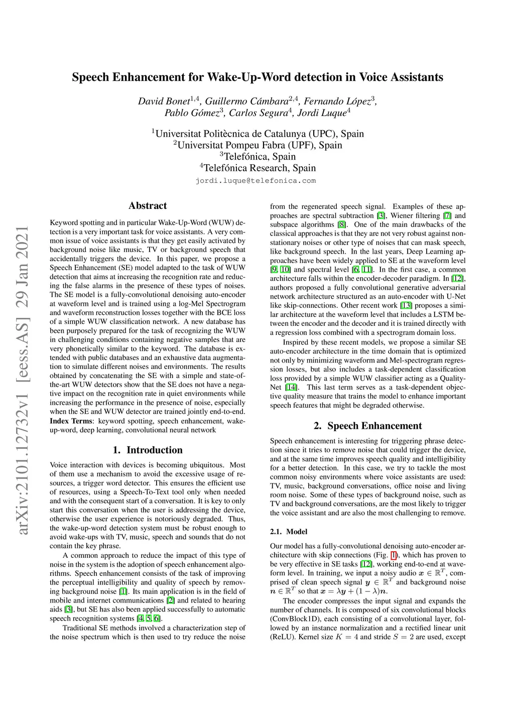 Keyword spotting and in particular Wake-Up-Word (WUW) detection is a very important task for voice assistants. A very common issue of voice assistants is that they get easily activated by background noise like music, TV or background speech that accidentally triggers the device. In this paper, we propose a Speech Enhancement (SE) model adapted to the task of WUW detection that aims at increasing the recognition rate and reducing the false alarms in the presence of these types of noises. The SE model is a fully-convolutional denoising auto-encoder at waveform level and is trained using a log-Mel Spectrogram and waveform reconstruction losses together with the BCE loss of a simple WUW classification network. A new database has been purposely prepared for the task of recognizing the WUW in challenging conditions containing negative samples that are very phonetically similar to the keyword. The database is extended with public databases and an exhaustive data augmentation to simulate different noises and environments. The results obtained by concatenating the SE with a simple and state-of-the-art WUW detectors show that the SE does not have a negative impact on the recognition rate in quiet environments while increasing the performance in the presence of noise, especially when the SE and WUW detector are trained jointly end-to-end.