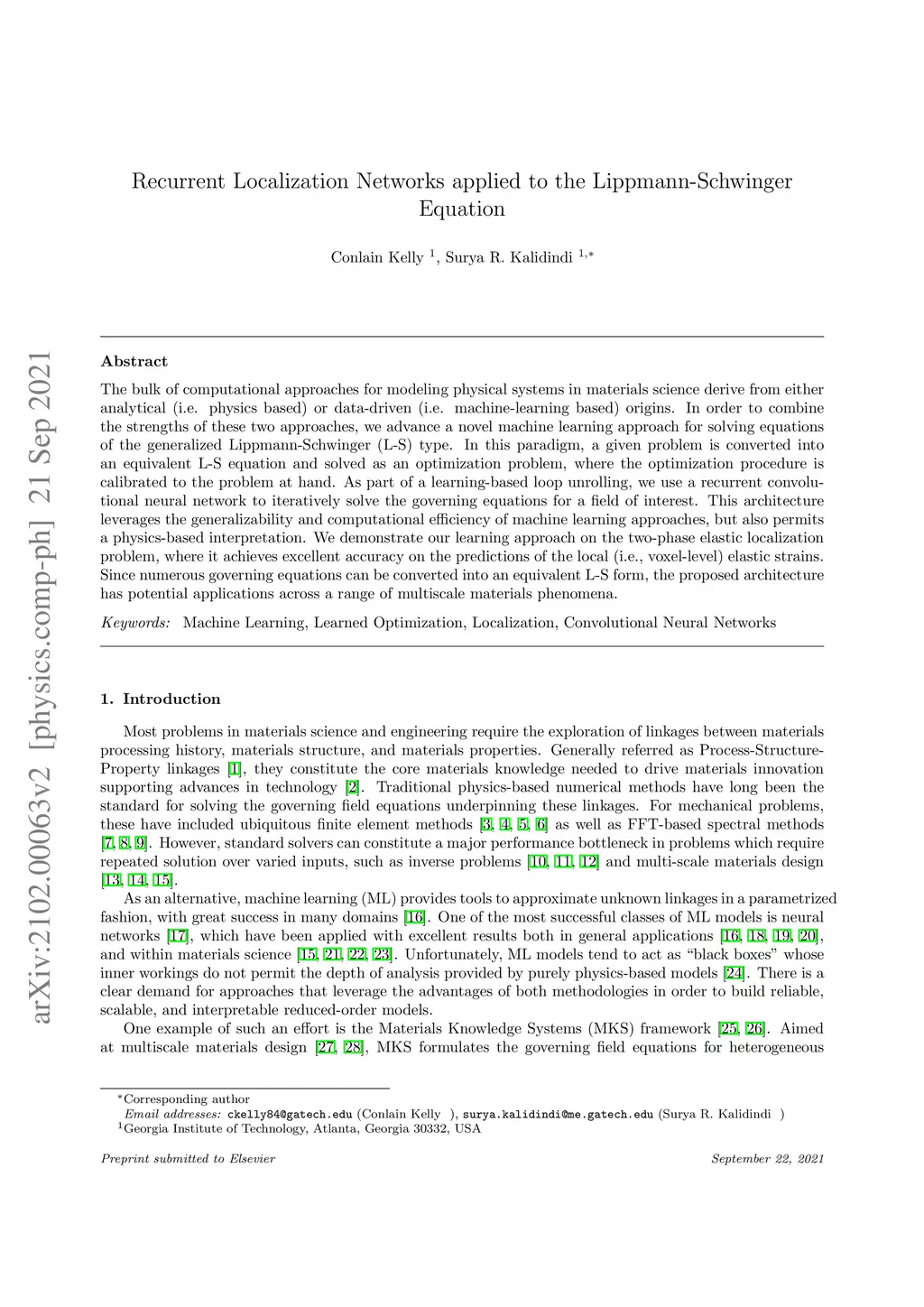 The bulk of computational approaches for modeling physical systems in materials science derive from either analytical (i.e. physics based) or data-driven (i.e. machine-learning based) origins. In order to combine the strengths of these two approaches, we advance a novel machine learning approach for solving equations of the generalized Lippmann-Schwinger (L-S) type. In this paradigm, a given problem is converted into an equivalent L-S equation and solved as an optimization problem, where the optimization procedure is calibrated to the problem at hand. As part of a learning-based loop unrolling, we use a recurrent convolutional neural network to iteratively solve the governing equations for a field of interest. This architecture leverages the generalizability and computational efficiency of machine learning approaches, but also permits a physics-based interpretation. We demonstrate our learning approach on the two-phase elastic localization problem, where it achieves excellent accuracy on the predictions of the local (i.e., voxel-level) elastic strains. Since numerous governing equations can be converted into an equivalent L-S form, the proposed architecture has potential applications across a range of multiscale materials phenomena.