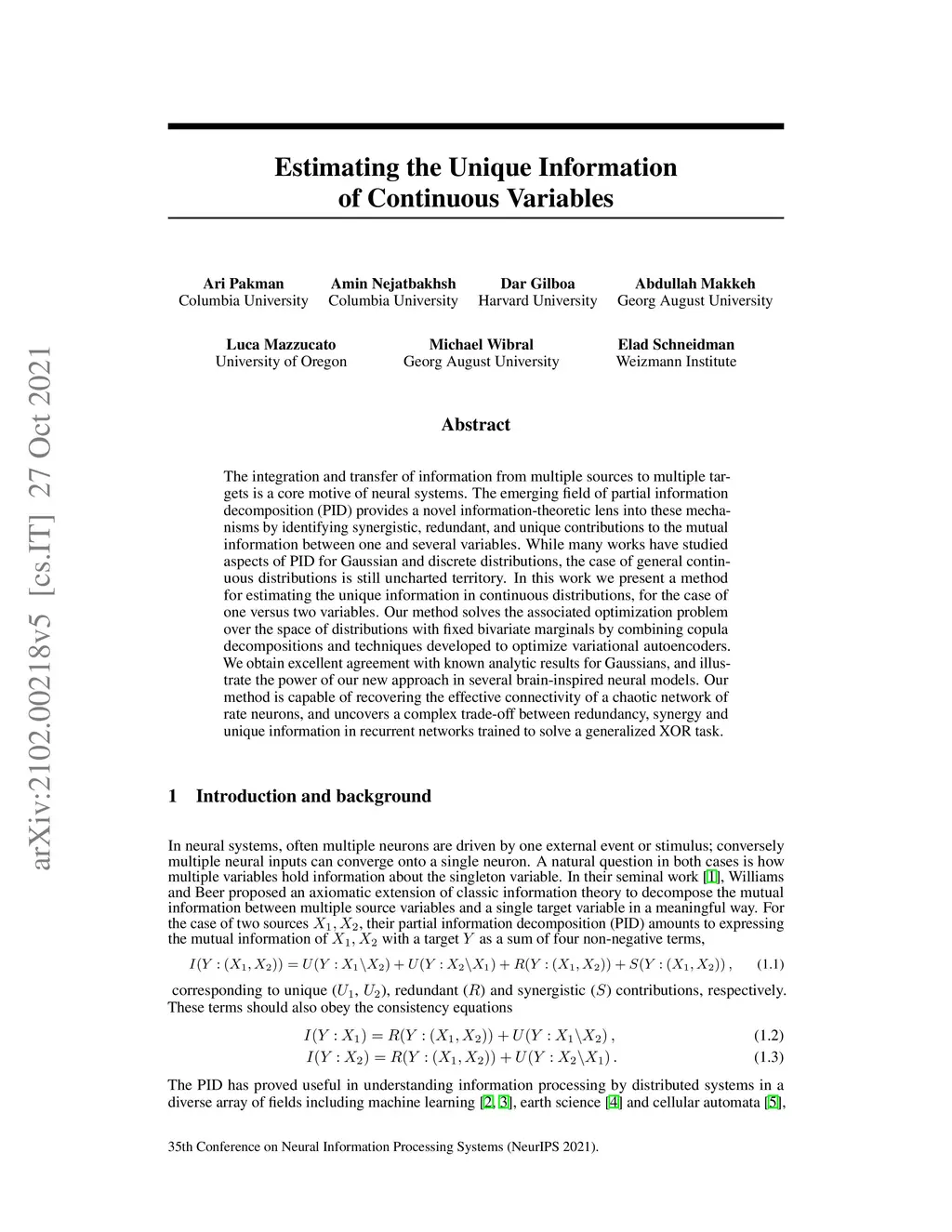 The integration and transfer of information from multiple sources to multiple targets is a core motive of neural systems. The emerging field of partial information decomposition (PID) provides a novel information-theoretic lens into these mechanisms by identifying synergistic, redundant, and unique contributions to the mutual information between one and several variables. While many works have studied aspects of PID for Gaussian and discrete distributions, the case of general continuous distributions is still uncharted territory. In this work we present a method for estimating the unique information in continuous distributions, for the case of one versus two variables. Our method solves the associated optimization problem over the space of distributions with fixed bivariate marginals by combining copula decompositions and techniques developed to optimize variational autoencoders. We obtain excellent agreement with known analytic results for Gaussians, and illustrate the power of our new approach in several brain-inspired neural models. Our method is capable of recovering the effective connectivity of a chaotic network of rate neurons, and uncovers a complex trade-off between redundancy, synergy and unique information in recurrent networks trained to solve a generalized XOR task.