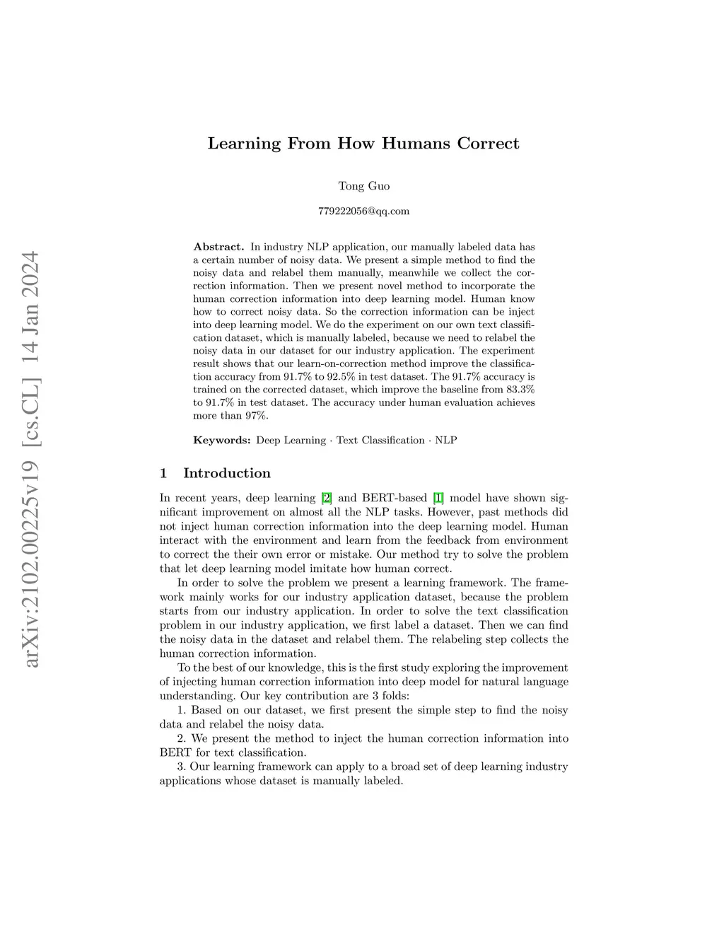 In industry NLP application, our manually labeled data has a certain number of noisy data. We present a simple method to find the noisy data and relabel them manually, meanwhile we collect the correction information. Then we present novel method to incorporate the human correction information into deep learning model. Human know how to correct noisy data. So the correction information can be inject into deep learning model. We do the experiment on our own text classification dataset, which is manually labeled, because we need to relabel the noisy data in our dataset for our industry application. The experiment result shows that our learn-on-correction method improve the classification accuracy from 91.7% to 92.5% in test dataset. The 91.7% accuracy is trained on the corrected dataset, which improve the baseline from 83.3% to 91.7% in test dataset. The accuracy under human evaluation achieves more than 97%.