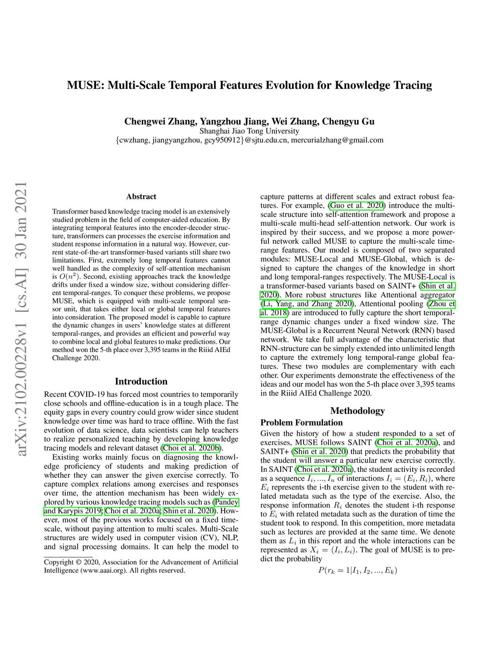 Transformer based knowledge tracing model is an extensively studied problem in the field of computer-aided education. By integrating temporal features into the encoder-decoder structure, transformers can processes the exercise information and student response information in a natural way. However, current state-of-the-art transformer-based variants still share two limitations. First, extremely long temporal features cannot well handled as the complexity of self-attention mechanism is O(n2). Second, existing approaches track the knowledge drifts under fixed a window size, without considering different temporal-ranges. To conquer these problems, we propose MUSE, which is equipped with multi-scale temporal sensor unit, that takes either local or global temporal features into consideration. The proposed model is capable to capture the dynamic changes in users knowledge states at different temporal-ranges, and provides an efficient and powerful way to combine local and global features to make predictions. Our method won the 5-th place over 3,395 teams in the Riiid AIEd Challenge 2020.