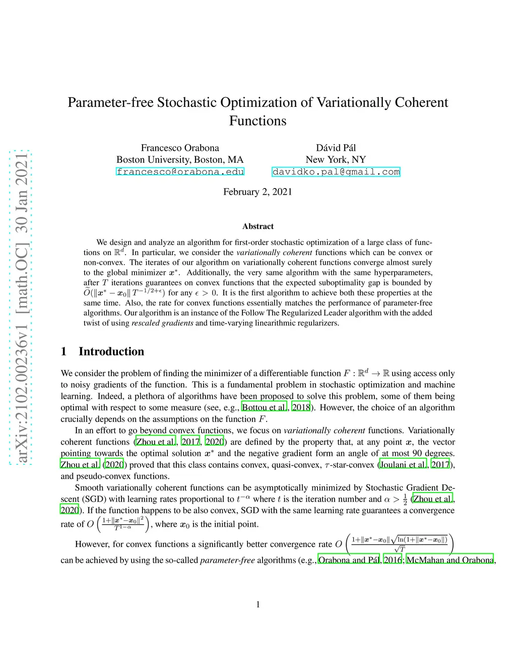 We design and analyze an algorithm for first-order stochastic optimization of a large class of functions on . In particular, we consider the \emph{variationally coherent} functions which can be convex or non-convex. The iterates of our algorithm on variationally coherent functions converge almost surely to the global minimizer . Additionally, the very same algorithm with the same hyperparameters, after iterations guarantees on convex functions that the expected suboptimality gap is bounded by for any . It is the first algorithm to achieve both these properties at the same time. Also, the rate for convex functions essentially matches the performance of parameter-free algorithms. Our algorithm is an instance of the Follow The Regularized Leader algorithm with the added twist of using \emph{rescaled gradients} and time-varying linearithmic regularizers.