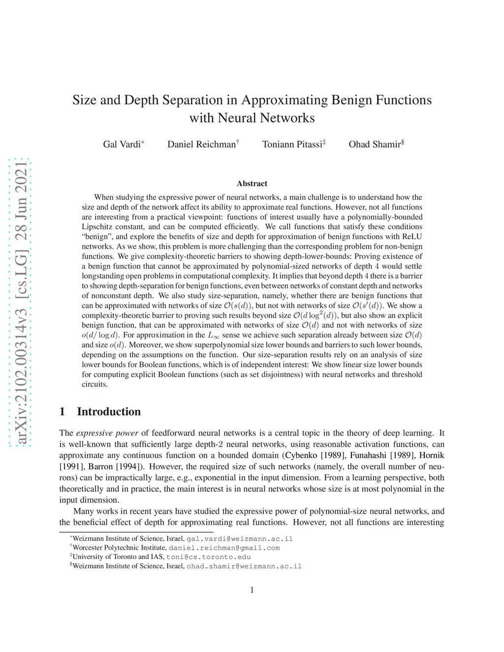 When studying the expressive power of neural networks, a main challenge is to understand how the size and depth of the network affect its ability to approximate real functions. However, not all functions are interesting from a practical viewpoint: functions of interest usually have a polynomially-bounded Lipschitz constant, and can be computed efficiently. We call functions that satisfy these conditions "benign", and explore the benefits of size and depth for approximation of benign functions with ReLU networks. As we show, this problem is more challenging than the corresponding problem for non-benign functions. We give barriers to showing depth-lower-bounds: Proving existence of a benign function that cannot be approximated by polynomial-size networks of depth would settle longstanding open problems in computational complexity. It implies that beyond depth there is a barrier to showing depth-separation for benign functions, even between networks of constant depth and networks of nonconstant depth. We also study size-separation, namely, whether there are benign functions that can be approximated with networks of size , but not with networks of size . We show a complexity-theoretic barrier to proving such results beyond size , but also show an explicit benign function, that can be approximated with networks of size and not with networks of size . For approximation in we achieve such separation already between size and size . Moreover, we show superpolynomial size lower bounds and barriers to such lower bounds, depending on the assumptions on the function. Our size-separation results rely on an analysis of size lower bounds for Boolean functions, which is of independent interest: We show linear size lower bounds for computing explicit Boolean functions with neural networks and threshold circuits.