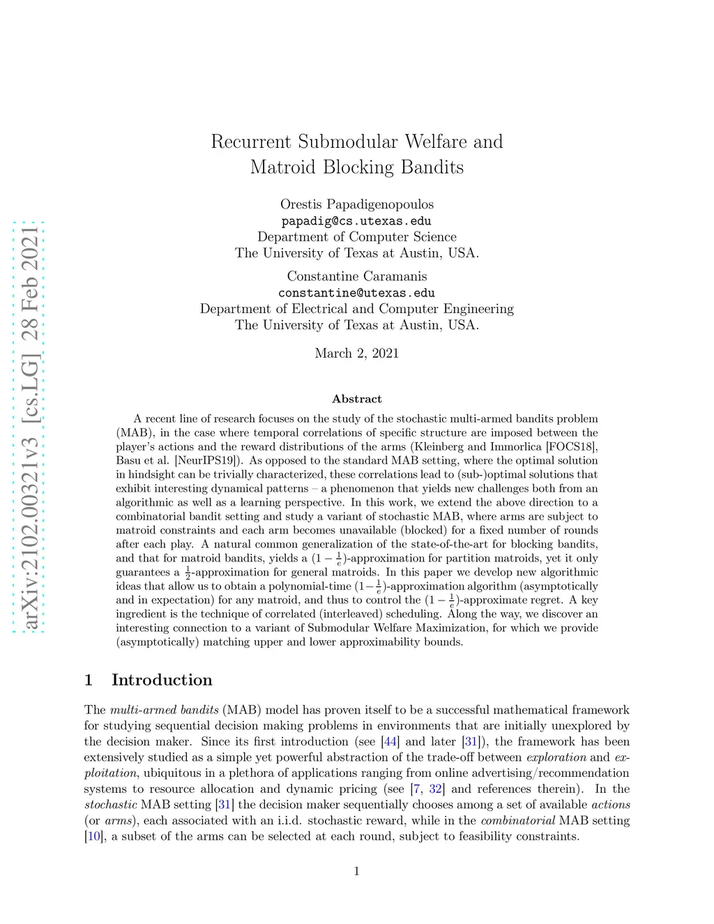 Recurrent Submodular Welfare and Matroid Blocking Bandits
