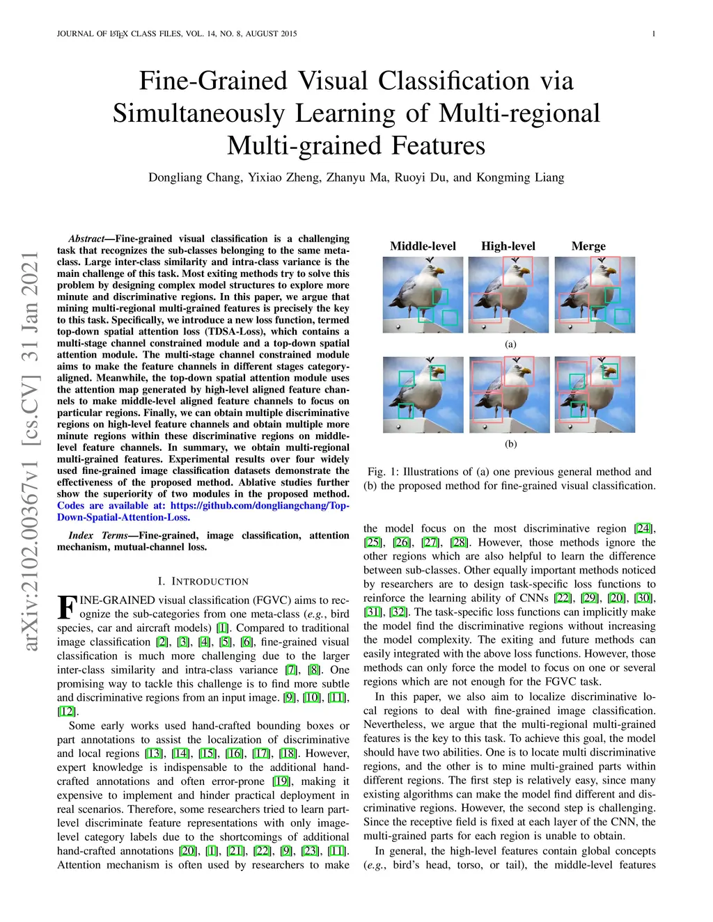 Fine-grained visual classification is a challenging task that recognizes the sub-classes belonging to the same meta-class. Large inter-class similarity and intra-class variance is the main challenge of this task. Most exiting methods try to solve this problem by designing complex model structures to explore more minute and discriminative regions. In this paper, we argue that mining multi-regional multi-grained features is precisely the key to this task. Specifically, we introduce a new loss function, termed top-down spatial attention loss (TDSA-Loss), which contains a multi-stage channel constrained module and a top-down spatial attention module. The multi-stage channel constrained module aims to make the feature channels in different stages category-aligned. Meanwhile, the top-down spatial attention module uses the attention map generated by high-level aligned feature channels to make middle-level aligned feature channels to focus on particular regions. Finally, we can obtain multiple discriminative regions on high-level feature channels and obtain multiple more minute regions within these discriminative regions on middle-level feature channels. In summary, we obtain multi-regional multi-grained features. Experimental results over four widely used fine-grained image classification datasets demonstrate the effectiveness of the proposed method. Ablative studies further show the superiority of two modules in the proposed method. Codes are available at: https://github.com/dongliangchang/Top-Down-Spatial-Attention-Loss.