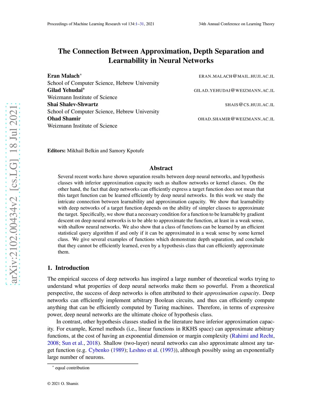 The Connection Between Approximation, Depth Separation and Learnability
