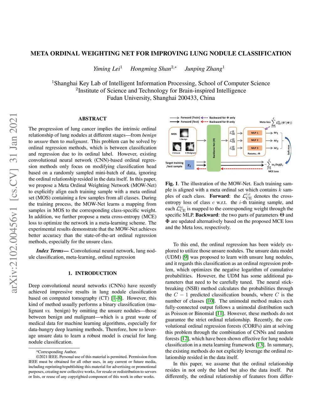 The progression of lung cancer implies the intrinsic ordinal relationship of lung nodules at different stages-from benign to unsure then to malignant. This problem can be solved by ordinal regression methods, which is between classification and regression due to its ordinal label. However, existing convolutional neural network (CNN)-based ordinal regression methods only focus on modifying classification head based on a randomly sampled mini-batch of data, ignoring the ordinal relationship resided in the data itself. In this paper, we propose a Meta Ordinal Weighting Network (MOW-Net) to explicitly align each training sample with a meta ordinal set (MOS) containing a few samples from all classes. During the training process, the MOW-Net learns a mapping from samples in MOS to the corresponding class-specific weight. In addition, we further propose a meta cross-entropy (MCE) loss to optimize the network in a meta-learning scheme. The experimental results demonstrate that the MOW-Net achieves better accuracy than the state-of-the-art ordinal regression methods, especially for the unsure class.