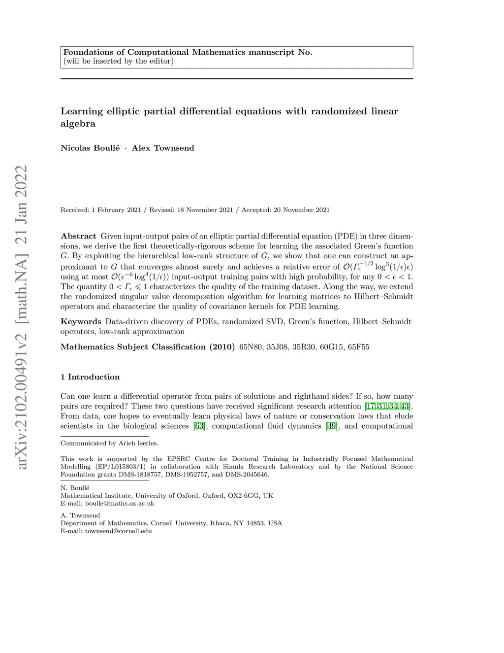 Given input-output pairs of an elliptic partial differential equation (PDE) in three dimensions, we derive the first theoretically-rigorous scheme for learning the associated Green's function . By exploiting the hierarchical low-rank structure of , we show that one can construct an approximant to that converges almost surely and achieves a relative error of using at most input-output training pairs with high probability, for any . The quantity characterizes the quality of the training dataset. Along the way, we extend the randomized singular value decomposition algorithm for learning matrices to Hilbert--Schmidt operators and characterize the quality of covariance kernels for PDE learning.