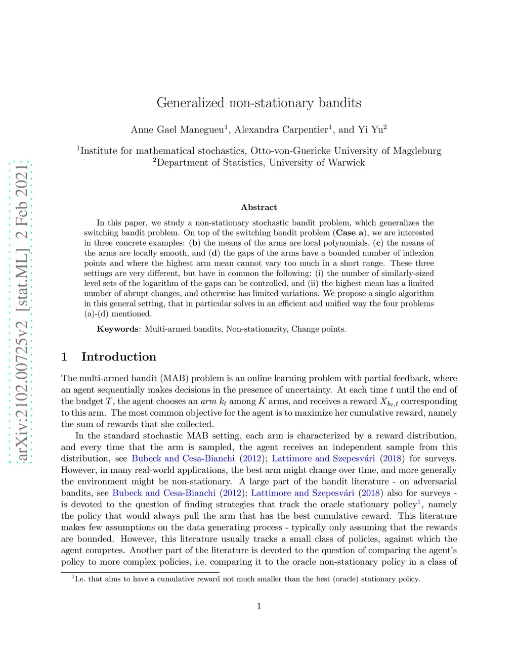 In this paper, we study a non-stationary stochastic bandit problem, which generalizes the switching bandit problem. On top of the switching bandit problem (\textbf{Case a}), we are interested in three concrete examples: (\textbf{b}) the means of the arms are local polynomials, (\textbf{c}) the means of the arms are locally smooth, and (\textbf{d}) the gaps of the arms have a bounded number of inflexion points and where the highest arm mean cannot vary too much in a short range. These three settings are very different, but have in common the following: (i) the number of similarly-sized level sets of the logarithm of the gaps can be controlled, and (ii) the highest mean has a limited number of abrupt changes, and otherwise has limited variations. We propose a single algorithm in this general setting, that in particular solves in an efficient and unified way the four problems (a)-(d) mentioned.
