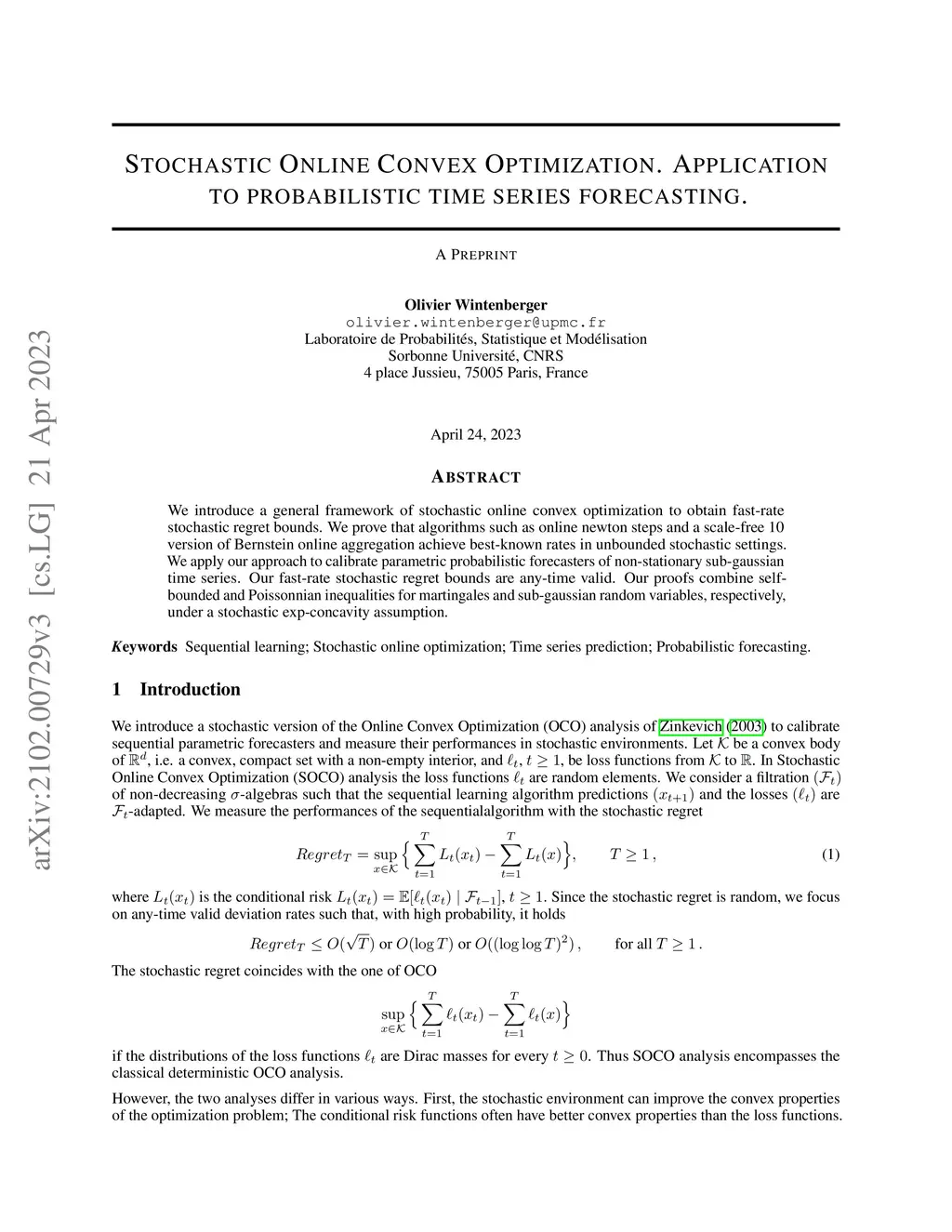 Stochastic Online Convex Optimization. Application to probabilistic time