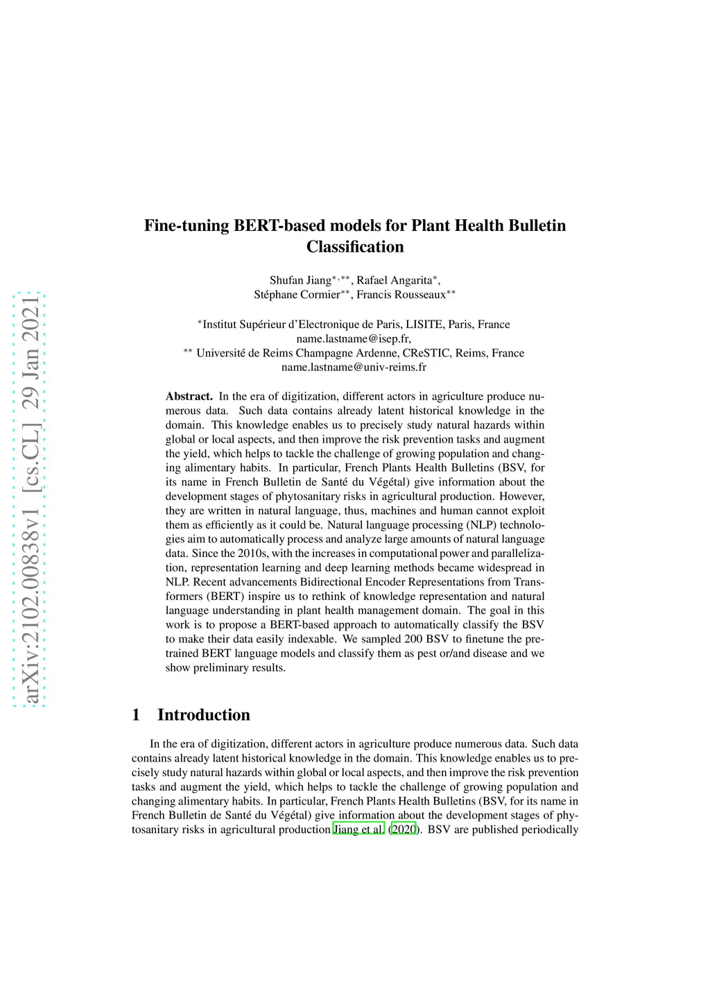 In the era of digitization, different actors in agriculture produce numerous data. Such data contains already latent historical knowledge in the domain. This knowledge enables us to precisely study natural hazards within global or local aspects, and then improve the risk prevention tasks and augment the yield, which helps to tackle the challenge of growing population and changing alimentary habits. In particular, French Plants Health Bulletins (BSV, for its name in French Bulletin de Sant{\é} du V{\é}g{\é}tal) give information about the development stages of phytosanitary risks in agricultural production. However, they are written in natural language, thus, machines and human cannot exploit them as efficiently as it could be. Natural language processing (NLP) technologies aim to automatically process and analyze large amounts of natural language data. Since the 2010s, with the increases in computational power and parallelization, representation learning and deep learning methods became widespread in NLP. Recent advancements Bidirectional Encoder Representations from Transformers (BERT) inspire us to rethink of knowledge representation and natural language understanding in plant health management domain. The goal in this work is to propose a BERT-based approach to automatically classify the BSV to make their data easily indexable. We sampled 200 BSV to finetune the pretrained BERT language models and classify them as pest or/and disease and we show preliminary results.
