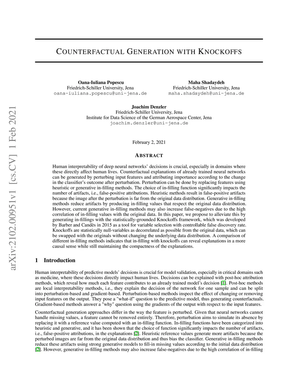 Human interpretability of deep neural networks' decisions is crucial, especially in domains where these directly affect human lives. Counterfactual explanations of already trained neural networks can be generated by perturbing input features and attributing importance according to the change in the classifier's outcome after perturbation. Perturbation can be done by replacing features using heuristic or generative in-filling methods. The choice of in-filling function significantly impacts the number of artifacts, i.e., false-positive attributions. Heuristic methods result in false-positive artifacts because the image after the perturbation is far from the original data distribution. Generative in-filling methods reduce artifacts by producing in-filling values that respect the original data distribution. However, current generative in-filling methods may also increase false-negatives due to the high correlation of in-filling values with the original data. In this paper, we propose to alleviate this by generating in-fillings with the statistically-grounded Knockoffs framework, which was developed by Barber and Cand\`es in 2015 as a tool for variable selection with controllable false discovery rate. Knockoffs are statistically null-variables as decorrelated as possible from the original data, which can be swapped with the originals without changing the underlying data distribution. A comparison of different in-filling methods indicates that in-filling with knockoffs can reveal explanations in a more causal sense while still maintaining the compactness of the explanations.