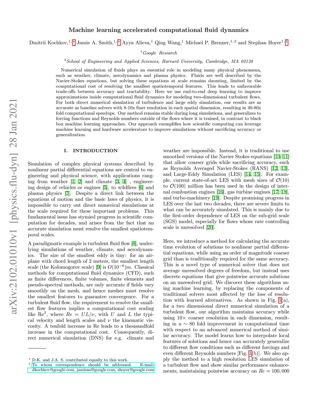 Numerical simulation of fluids plays an essential role in modeling many physical phenomena, such as weather, climate, aerodynamics and plasma physics. Fluids are well described by the Navier-Stokes equations, but solving these equations at scale remains daunting, limited by the computational cost of resolving the smallest spatiotemporal features. This leads to unfavorable trade-offs between accuracy and tractability. Here we use end-to-end deep learning to improve approximations inside computational fluid dynamics for modeling two-dimensional turbulent flows. For both direct numerical simulation of turbulence and large eddy simulation, our results are as accurate as baseline solvers with 8-10x finer resolution in each spatial dimension, resulting in 40-80x fold computational speedups. Our method remains stable during long simulations, and generalizes to forcing functions and Reynolds numbers outside of the flows where it is trained, in contrast to black box machine learning approaches. Our approach exemplifies how scientific computing can leverage machine learning and hardware accelerators to improve simulations without sacrificing accuracy or generalization.