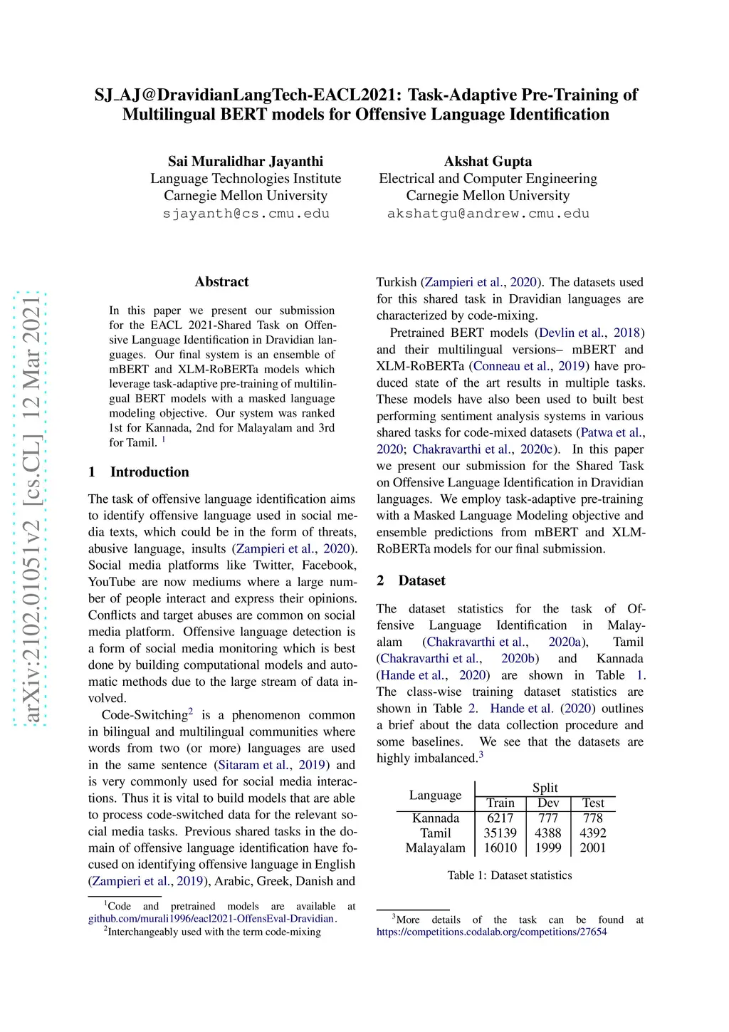 SJ_AJ@DravidianLangTech-EACL2021: Task-Adaptive Pre-Training of