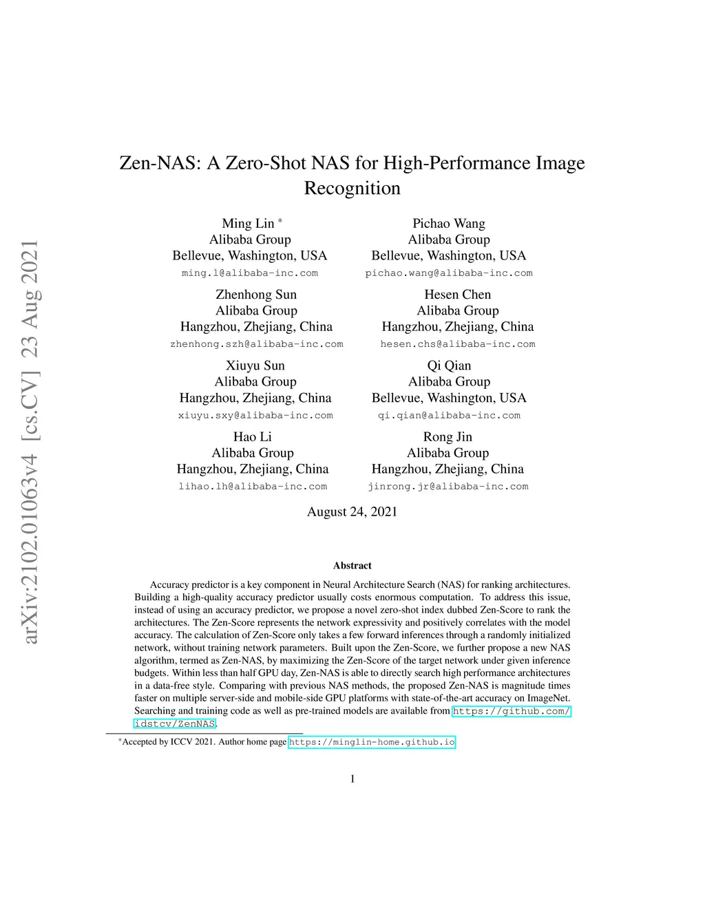 Zen-NAS: A Zero-Shot NAS for High-Performance Deep Image Recognition