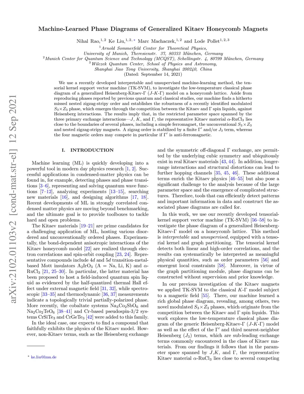 We use a recently developed interpretable and unsupervised machine-learning method, the tensorial kernel support vector machine (TK-SVM), to investigate the low-temperature classical phase diagram of a generalized Heisenberg-Kitaev- (--) model on a honeycomb lattice. Aside from reproducing phases reported by previous quantum and classical studies, our machine finds a hitherto missed nested zigzag-stripy order and establishes the robustness of a recently identified modulated phase, which emerges through the competition between the Kitaev and spin liquids, against Heisenberg interactions. The results imply that, in the restricted parameter space spanned by the three primary exchange interactions -- , , and , the representative Kitaev material - lies close to the boundaries of several phases, including a simple ferromagnet, the unconventional and nested zigzag-stripy magnets. A zigzag order is stabilized by a finite and/or term, whereas the four magnetic orders may compete in particular if is anti-ferromagnetic.
