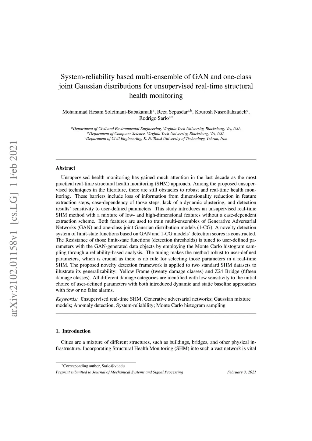 Unsupervised health monitoring has gained much attention in the last decade as the most practical real-time structural health monitoring (SHM) approach. Among the proposed unsupervised techniques in the literature, there are still obstacles to robust and real-time health monitoring. These barriers include loss of information from dimensionality reduction in feature extraction steps, case-dependency of those steps, lack of a dynamic clustering, and detection results' sensitivity to user-defined parameters. This study introduces an unsupervised real-time SHM method with a mixture of low- and high-dimensional features without a case-dependent extraction scheme. Both features are used to train multi-ensembles of Generative Adversarial Networks (GAN) and one-class joint Gaussian distribution models (1-CG). A novelty detection system of limit-state functions based on GAN and 1-CG models' detection scores is constructed. The Resistance of those limit-state functions (detection thresholds) is tuned to user-defined parameters with the GAN-generated data objects by employing the Monte Carlo histogram sampling through a reliability-based analysis. The tuning makes the method robust to user-defined parameters, which is crucial as there is no rule for selecting those parameters in a real-time SHM. The proposed novelty detection framework is applied to two standard SHM datasets to illustrate its generalizability: Yellow Frame (twenty damage classes) and Z24 Bridge (fifteen damage classes). All different damage categories are identified with low sensitivity to the initial choice of user-defined parameters with both introduced dynamic and static baseline approaches with few or no false alarms.