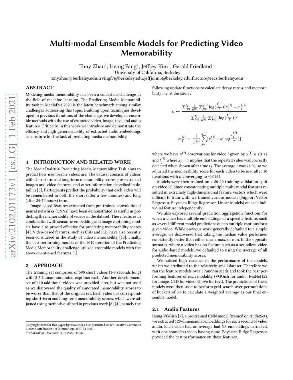Modeling media memorability has been a consistent challenge in the field of machine learning. The Predicting Media Memorability task in MediaEval2020 is the latest benchmark among similar challenges addressing this topic. Building upon techniques developed in previous iterations of the challenge, we developed ensemble methods with the use of extracted video, image, text, and audio features. Critically, in this work we introduce and demonstrate the efficacy and high generalizability of extracted audio embeddings as a feature for the task of predicting media memorability.