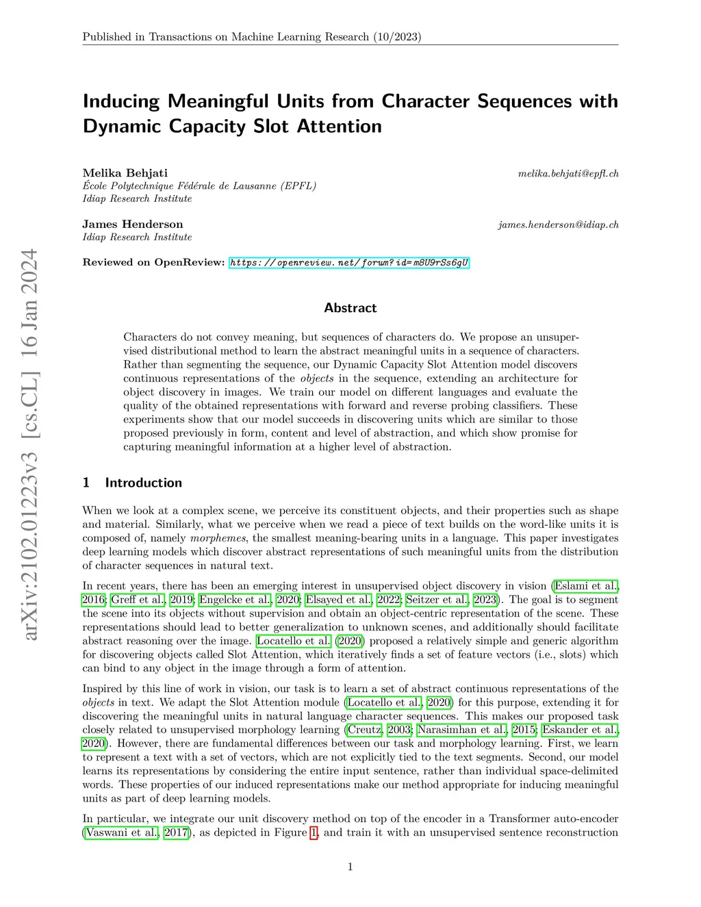 Characters do not convey meaning, but sequences of characters do. We propose an unsupervised distributional method to learn the abstract meaningful units in a sequence of characters. Rather than segmenting the sequence, our Dynamic Capacity Slot Attention model discovers continuous representations of the objects in the sequence, extending an architecture for object discovery in images. We train our model on different languages and evaluate the quality of the obtained representations with forward and reverse probing classifiers. These experiments show that our model succeeds in discovering units which are similar to those proposed previously in form, content and level of abstraction, and which show promise for capturing meaningful information at a higher level of abstraction.
