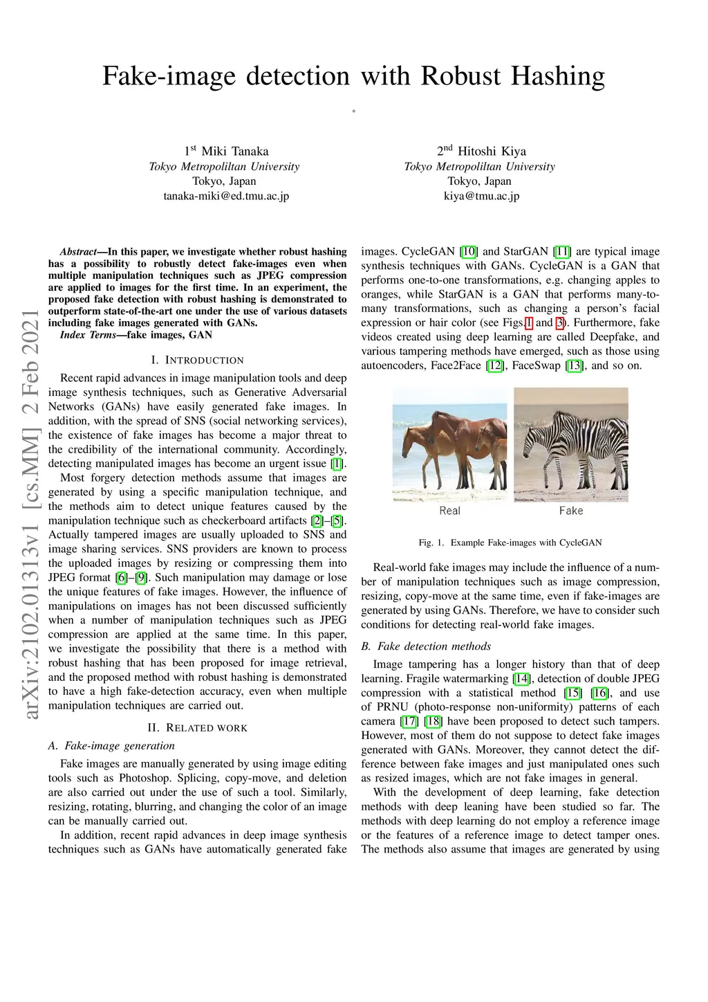 In this paper, we investigate whether robust hashing has a possibility to robustly detect fake-images even when multiple manipulation techniques such as JPEG compression are applied to images for the first time. In an experiment, the proposed fake detection with robust hashing is demonstrated to outperform state-of-the-art one under the use of various datasets including fake images generated with GANs.