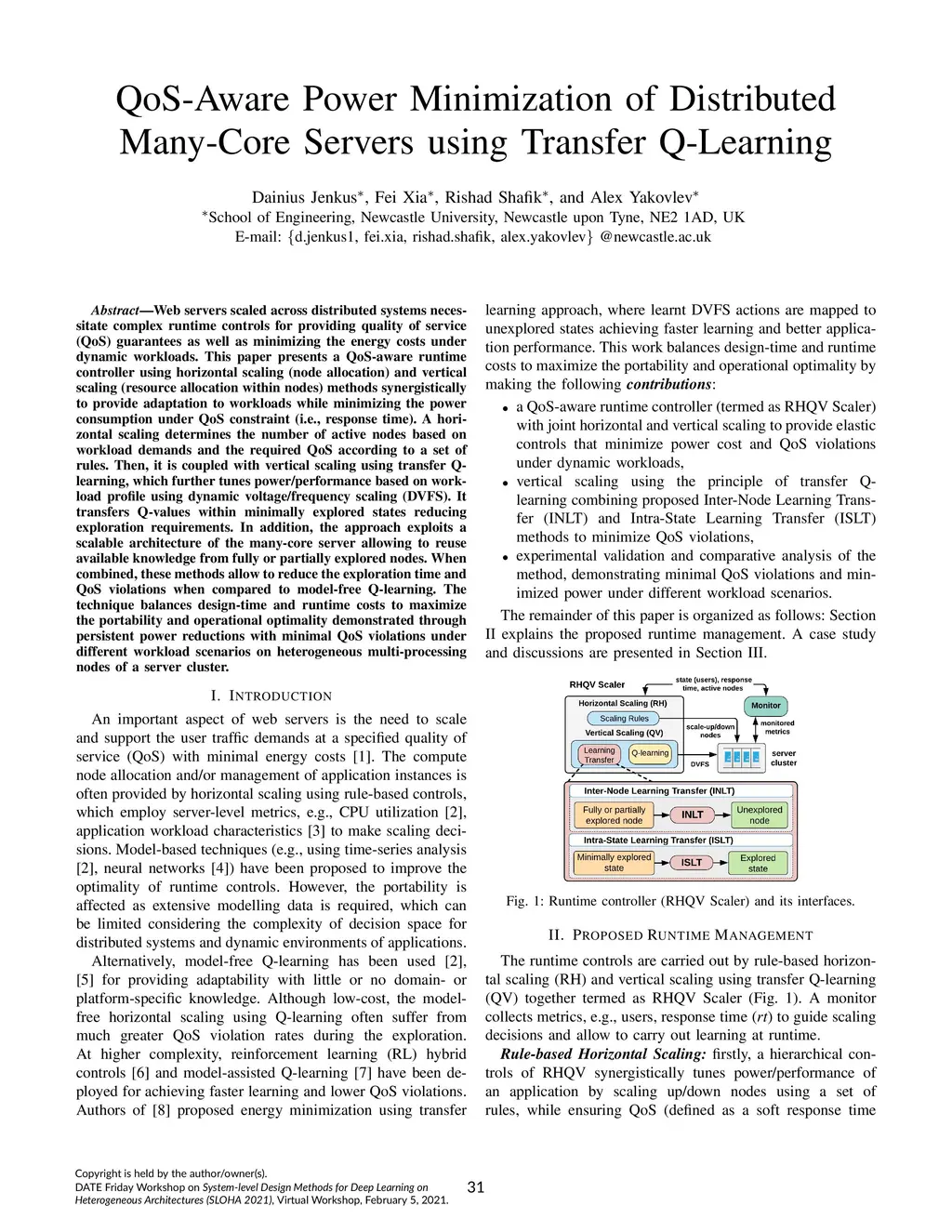 Web servers scaled across distributed systems necessitate complex runtime controls for providing quality of service (QoS) guarantees as well as minimizing the energy costs under dynamic workloads. This paper presents a QoS-aware runtime controller using horizontal scaling (node allocation) and vertical scaling (resource allocation within nodes) methods synergistically to provide adaptation to workloads while minimizing the power consumption under QoS constraint (i.e., response time). A horizontal scaling determines the number of active nodes based on workload demands and the required QoS according to a set of rules. Then, it is coupled with vertical scaling using transfer Q-learning, which further tunes power/performance based on workload profile using dynamic voltage/frequency scaling (DVFS). It transfers Q-values within minimally explored states reducing exploration requirements. In addition, the approach exploits a scalable architecture of the many-core server allowing to reuse available knowledge from fully or partially explored nodes. When combined, these methods allow to reduce the exploration time and QoS violations when compared to model-free Q-learning. The technique balances design-time and runtime costs to maximize the portability and operational optimality demonstrated through persistent power reductions with minimal QoS violations under different workload scenarios on heterogeneous multi-processing nodes of a server cluster.