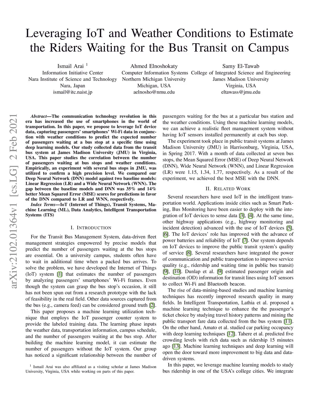 The communication technology revolution in this era has increased the use of smartphones in the world of transportation. In this paper, we propose to leverage IoT device data, capturing passengers' smartphones' Wi-Fi data in conjunction with weather conditions to predict the expected number of passengers waiting at a bus stop at a specific time using deep learning models. Our study collected data from the transit bus system at James Madison University (JMU) in Virginia, USA. This paper studies the correlation between the number of passengers waiting at bus stops and weather conditions. Empirically, an experiment with several bus stops in JMU, was utilized to confirm a high precision level. We compared our Deep Neural Network (DNN) model against two baseline models: Linear Regression (LR) and a Wide Neural Network (WNN). The gap between the baseline models and DNN was 35% and 14% better Mean Squared Error (MSE) scores for predictions in favor of the DNN compared to LR and WNN, respectively.