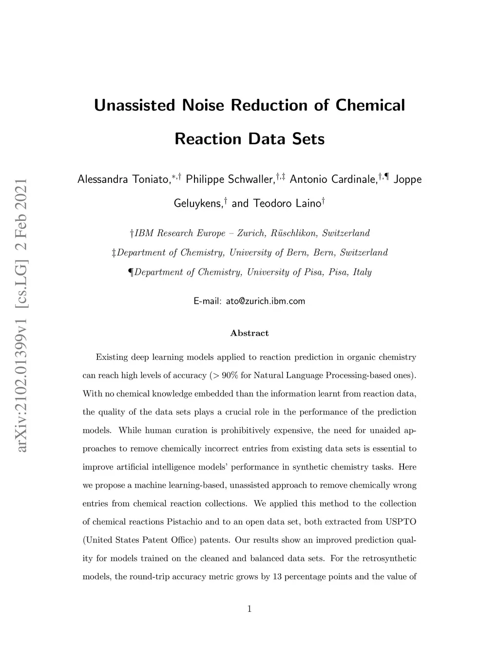 Existing deep learning models applied to reaction prediction in organic chemistry can reach high levels of accuracy (> 90% for Natural Language Processing-based ones). With no chemical knowledge embedded than the information learnt from reaction data, the quality of the data sets plays a crucial role in the performance of the prediction models. While human curation is prohibitively expensive, the need for unaided approaches to remove chemically incorrect entries from existing data sets is essential to improve artificial intelligence models' performance in synthetic chemistry tasks. Here we propose a machine learning-based, unassisted approach to remove chemically wrong entries from chemical reaction collections. We applied this method to the collection of chemical reactions Pistachio and to an open data set, both extracted from USPTO (United States Patent Office) patents. Our results show an improved prediction quality for models trained on the cleaned and balanced data sets. For the retrosynthetic models, the round-trip accuracy metric grows by 13 percentage points and the value of the cumulative Jensen Shannon divergence decreases by 30% compared to its original record. The coverage remains high with 97%, and the value of the class-diversity is not affected by the cleaning. The proposed strategy is the first unassisted rule-free technique to address automatic noise reduction in chemical data sets.
