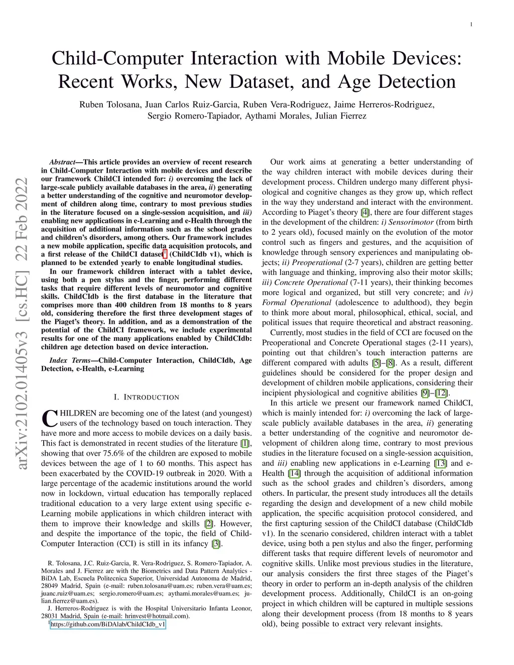 This article provides an overview of recent research in Child-Computer Interaction with mobile devices and describe our framework ChildCI intended for: i) overcoming the lack of large-scale publicly available databases in the area, ii) generating a better understanding of the cognitive and neuromotor development of children along time, contrary to most previous studies in the literature focused on a single-session acquisition, and iii) enabling new applications in e-Learning and e-Health through the acquisition of additional information such as the school grades and children's disorders, among others. Our framework includes a new mobile application, specific data acquisition protocols, and a first release of the ChildCI dataset (ChildCIdb v1), which is planned to be extended yearly to enable longitudinal studies. In our framework children interact with a tablet device, using both a pen stylus and the finger, performing different tasks that require different levels of neuromotor and cognitive skills. ChildCIdb is the first database in the literature that comprises more than 400 children from 18 months to 8 years old, considering therefore the first three development stages of the Piaget's theory. In addition, and as a demonstration of the potential of the ChildCI framework, we include experimental results for one of the many applications enabled by ChildCIdb: children age detection based on device interaction.