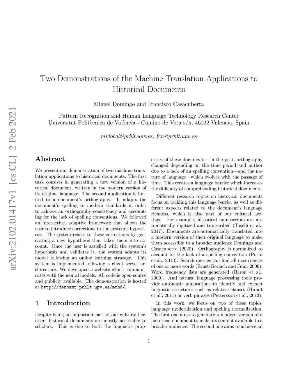 We present our demonstration of two machine translation applications to historical documents. The first task consists in generating a new version of a historical document, written in the modern version of its original language. The second application is limited to a document's orthography. It adapts the document's spelling to modern standards in order to achieve an orthography consistency and accounting for the lack of spelling conventions. We followed an interactive, adaptive framework that allows the user to introduce corrections to the system's hypothesis. The system reacts to these corrections by generating a new hypothesis that takes them into account. Once the user is satisfied with the system's hypothesis and validates it, the system adapts its model following an online learning strategy. This system is implemented following a client-server architecture. We developed a website which communicates with the neural models. All code is open-source and publicly available. The demonstration is hosted at http://demosmt.prhlt.upv.es/mthd/.