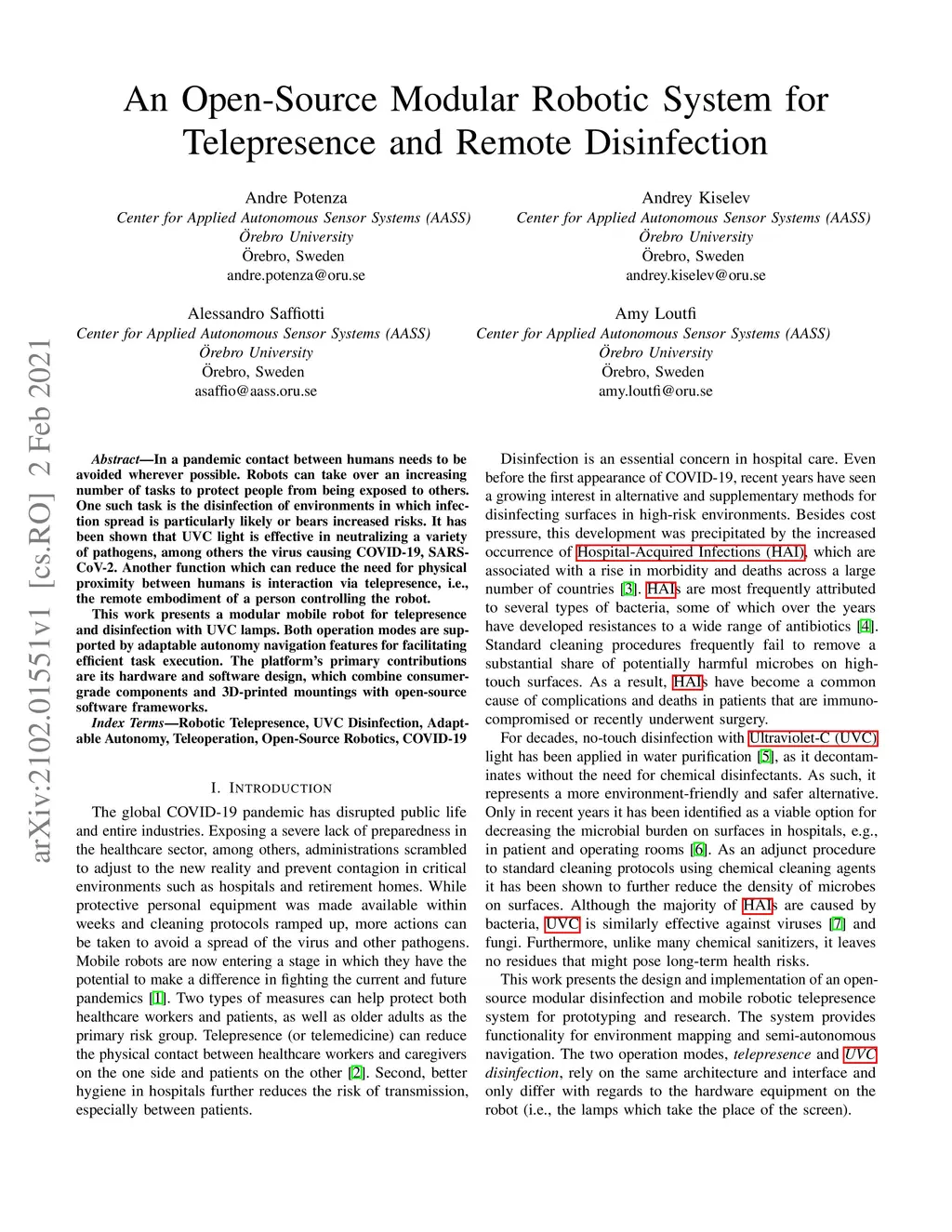 In a pandemic contact between humans needs to be avoided wherever possible. Robots can take over an increasing number of tasks to protect people from being exposed to others. One such task is the disinfection of environments in which infection spread is particularly likely or bears increased risks. It has been shown that UVC light is effective in neutralizing a variety of pathogens, among others the virus causing COVID-19, SARS-CoV-2. Another function which can reduce the need for physical proximity between humans is interaction via telepresence, i.e., the remote embodiment of a person controlling the robot. This work presents a modular mobile robot for telepresence and disinfection with UVC lamps. Both operation modes are supported by adaptable autonomy navigation features for facilitating efficient task execution. The platform's primary contributions are its hardware and software design, which combine consumer-grade components and 3D-printed mounting with open-source software frameworks.