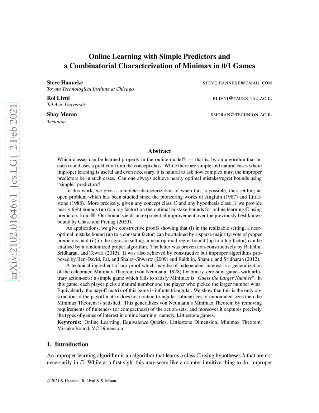 Which classes can be learned properly in the online model? -- that is, by an algorithm that at each round uses a predictor from the concept class. While there are simple and natural cases where improper learning is necessary, it is natural to ask how complex must the improper predictors be in such cases. Can one always achieve nearly optimal mistake/regret bounds using "simple" predictors? In this work, we give a complete characterization of when this is possible, thus settling an open problem which has been studied since the pioneering works of Angluin (1987) and Littlestone (1988). More precisely, given any concept class C and any hypothesis class H, we provide nearly tight bounds (up to a log factor) on the optimal mistake bounds for online learning C using predictors from H. Our bound yields an exponential improvement over the previously best known bound by Chase and Freitag (2020). As applications, we give constructive proofs showing that (i) in the realizable setting, a near-optimal mistake bound (up to a constant factor) can be attained by a sparse majority-vote of proper predictors, and (ii) in the agnostic setting, a near-optimal regret bound (up to a log factor) can be attained by a randomized proper algorithm. A technical ingredient of our proof which may be of independent interest is a generalization of the celebrated Minimax Theorem (von Neumann, 1928) for binary zero-sum games. A simple game which fails to satisfy Minimax is "Guess the Larger Number", where each player picks a number and the larger number wins. The payoff matrix is infinite triangular. We show this is the only obstruction: if a game does not contain triangular submatrices of unbounded sizes then the Minimax Theorem holds. This generalizes von Neumann's Minimax Theorem by removing requirements of finiteness (or compactness), and captures precisely the games of interest in online learning.