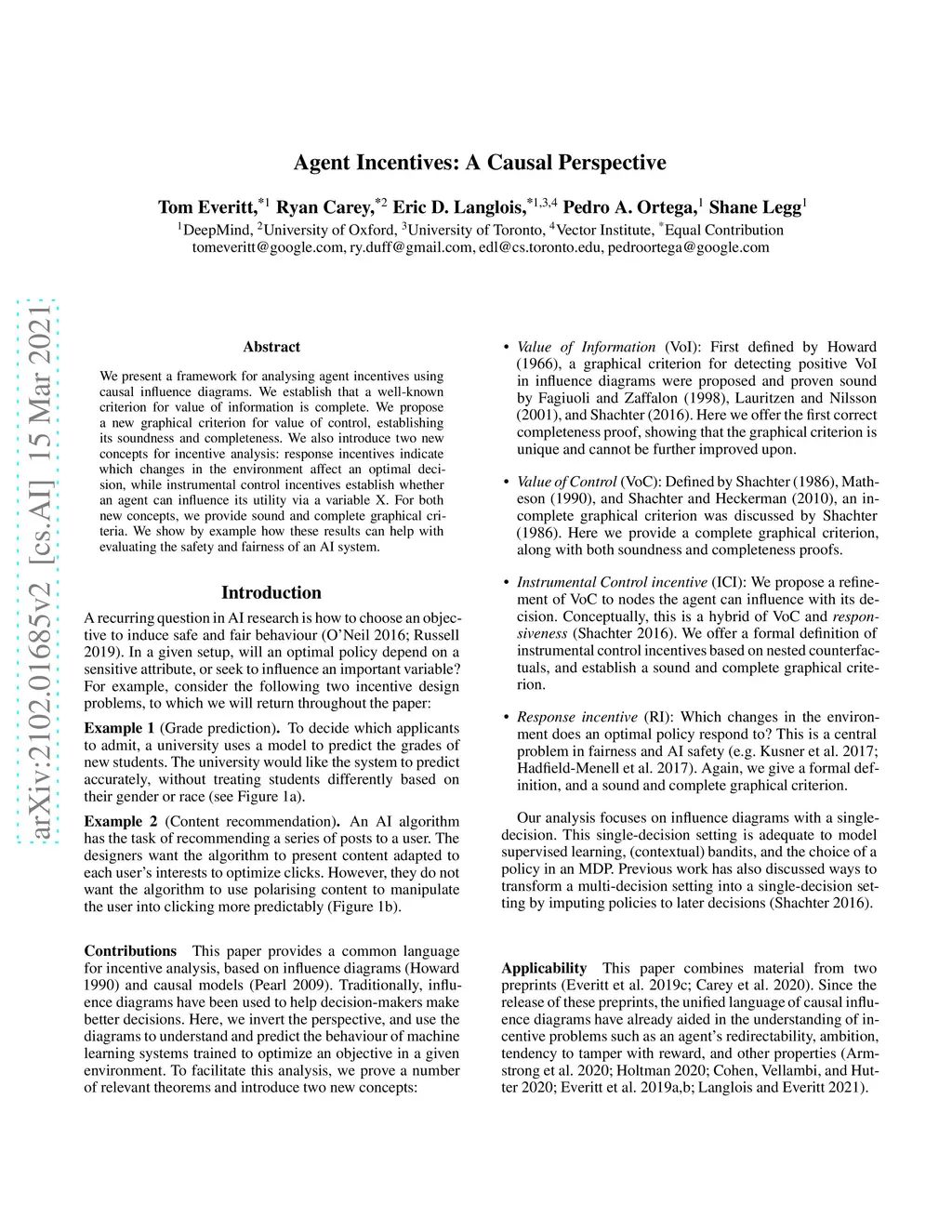 We present a framework for analysing agent incentives using causal influence diagrams. We establish that a well-known criterion for value of information is complete. We propose a new graphical criterion for value of control, establishing its soundness and completeness. We also introduce two new concepts for incentive analysis: response incentives indicate which changes in the environment affect an optimal decision, while instrumental control incentives establish whether an agent can influence its utility via a variable X. For both new concepts, we provide sound and complete graphical criteria. We show by example how these results can help with evaluating the safety and fairness of an AI system.