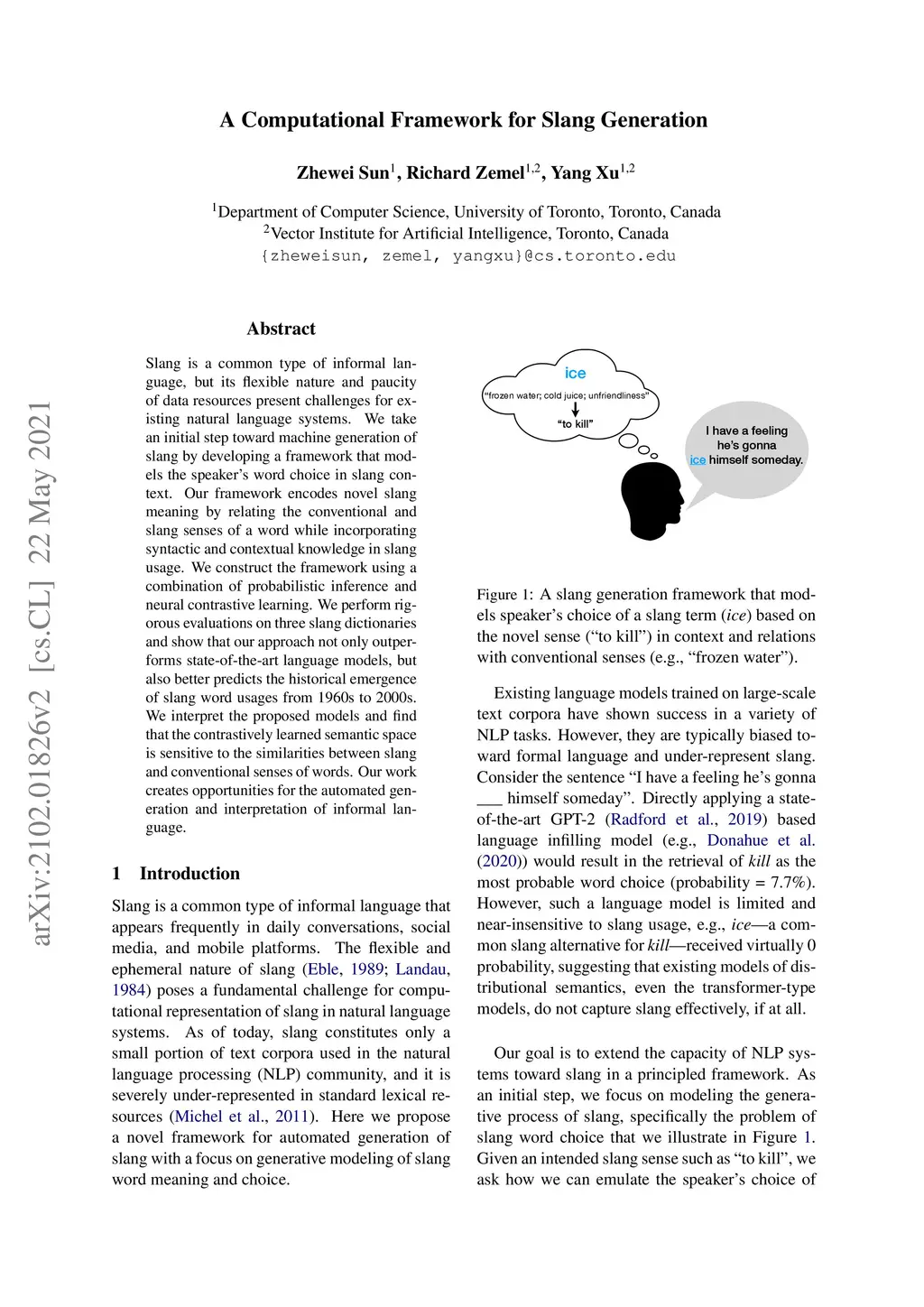 Slang is a common type of informal language, but its flexible nature and paucity of data resources present challenges for existing natural language systems. We take an initial step toward machine generation of slang by developing a framework that models the speaker's word choice in slang context. Our framework encodes novel slang meaning by relating the conventional and slang senses of a word while incorporating syntactic and contextual knowledge in slang usage. We construct the framework using a combination of probabilistic inference and neural contrastive learning. We perform rigorous evaluations on three slang dictionaries and show that our approach not only outperforms state-of-the-art language models, but also better predicts the historical emergence of slang word usages from 1960s to 2000s. We interpret the proposed models and find that the contrastively learned semantic space is sensitive to the similarities between slang and conventional senses of words. Our work creates opportunities for the automated generation and interpretation of informal language.