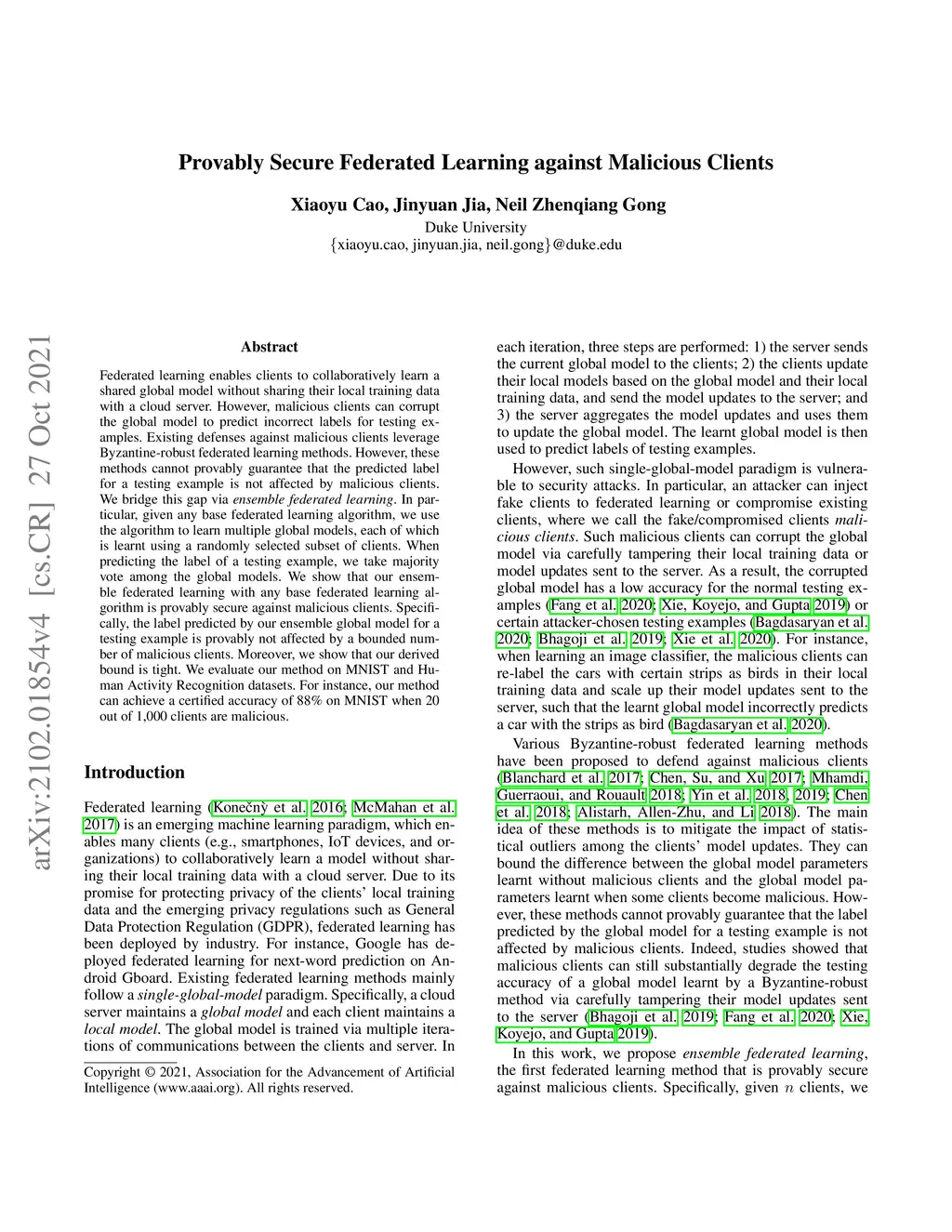 Federated learning enables clients to collaboratively learn a shared global model without sharing their local training data with a cloud server. However, malicious clients can corrupt the global model to predict incorrect labels for testing examples. Existing defenses against malicious clients leverage Byzantine-robust federated learning methods. However, these methods cannot provably guarantee that the predicted label for a testing example is not affected by malicious clients. We bridge this gap via ensemble federated learning. In particular, given any base federated learning algorithm, we use the algorithm to learn multiple global models, each of which is learnt using a randomly selected subset of clients. When predicting the label of a testing example, we take majority vote among the global models. We show that our ensemble federated learning with any base federated learning algorithm is provably secure against malicious clients. Specifically, the label predicted by our ensemble global model for a testing example is provably not affected by a bounded number of malicious clients. Moreover, we show that our derived bound is tight. We evaluate our method on MNIST and Human Activity Recognition datasets. For instance, our method can achieve a certified accuracy of 88% on MNIST when 20 out of 1,000 clients are malicious.