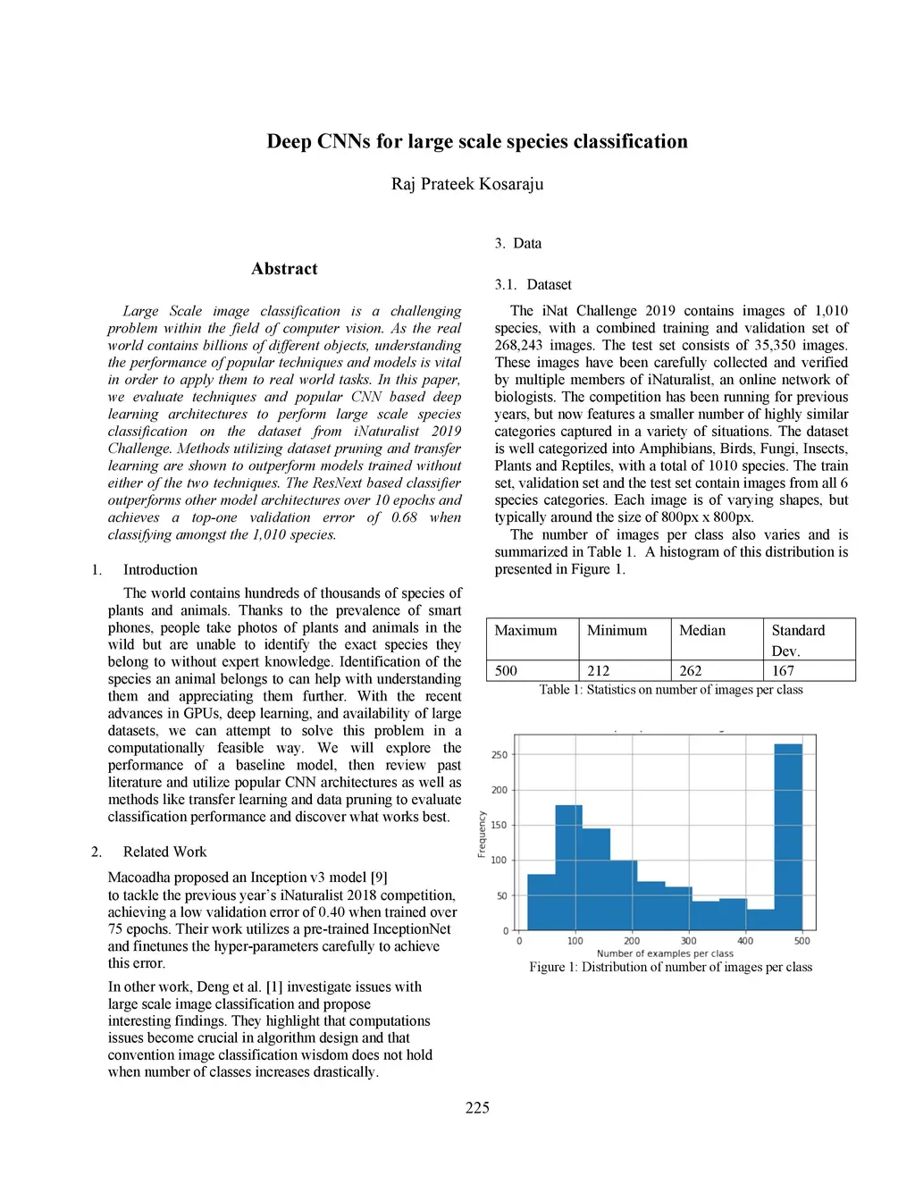Large Scale image classification is a challenging problem within the field of computer vision. As the real world contains billions of different objects, understanding the performance of popular techniques and models is vital in order to apply them to real world tasks. In this paper, we evaluate techniques and popular CNN based deep learning architectures to perform large scale species classification on the dataset from iNaturalist 2019 Challenge. Methods utilizing dataset pruning and transfer learning are shown to outperform models trained without either of the two techniques. The ResNext based classifier outperforms other model architectures over 10 epochs and achieves a top-one validation error of 0.68 when classifying amongst the 1,010 species.