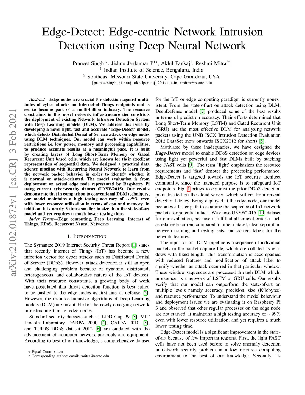 Edge nodes are crucial for detection against multitudes of cyber attacks on Internet-of-Things endpoints and is set to become part of a multi-billion industry. The resource constraints in this novel network infrastructure tier constricts the deployment of existing Network Intrusion Detection System with Deep Learning models (DLM). We address this issue by developing a novel light, fast and accurate Édge-Detect' model, which detects Distributed Denial of Service attack on edge nodes using DLM techniques. Our model can work within resource restrictions i.e. low power, memory and processing capabilities, to produce accurate results at a meaningful pace. It is built by creating layers of Long Short-Term Memory or Gated Recurrent Unit based cells, which are known for their excellent representation of sequential data. We designed a practical data science pipeline with Recurring Neural Network to learn from the network packet behavior in order to identify whether it is normal or attack-oriented. The model evaluation is from deployment on actual edge node represented by Raspberry Pi using current cybersecurity dataset (UNSW2015). Our results demonstrate that in comparison to conventional DLM techniques, our model maintains a high testing accuracy of 99% even with lower resource utilization in terms of cpu and memory. In addition, it is nearly 3 times smaller in size than the state-of-art model and yet requires a much lower testing time.