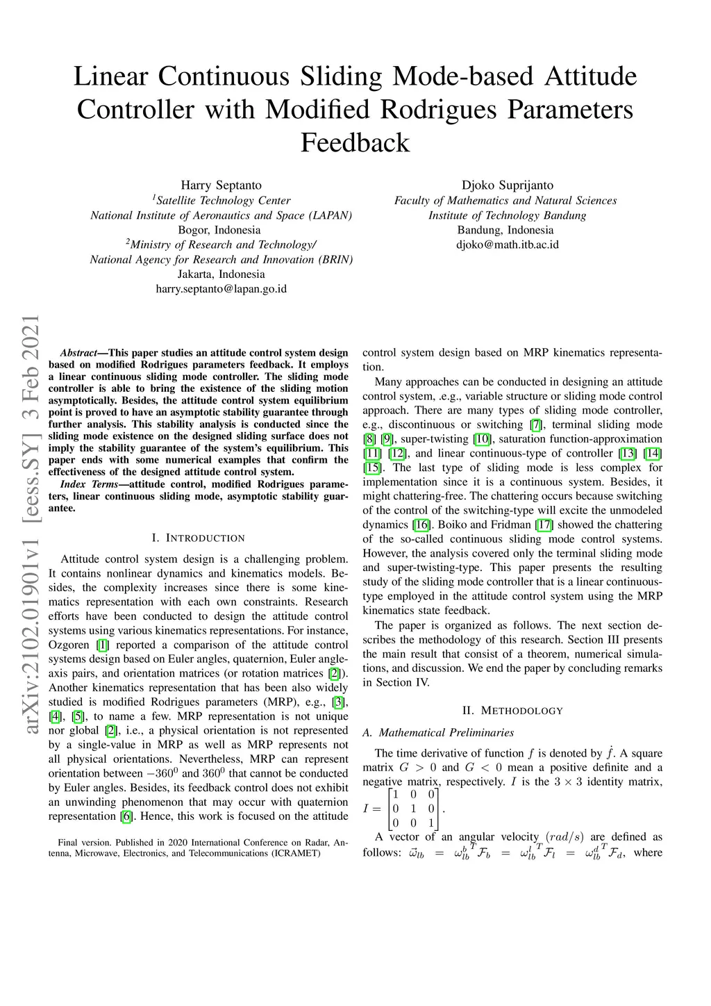 This paper studies an attitude control system design based on modified Rodrigues parameters feedback. It employs a linear continuous sliding mode controller. The sliding mode controller is able to bring the existence of the sliding motion asymptotically. Besides, the attitude control system equilibrium point is proved to have an asymptotic stability guarantee through further analysis. This stability analysis is conducted since the sliding mode existence on the designed sliding surface does not imply the stability guarantee of the system's equilibrium. This paper ends with some numerical examples that confirm the effectiveness of the designed attitude control system.