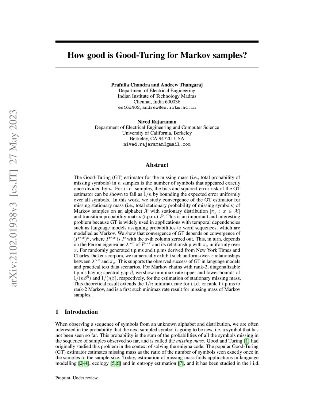 The Good-Turing (GT) estimator for the missing mass (i.e., total probability of missing symbols) in samples is the number of symbols that appeared exactly once divided by . For i.i.d. samples, the bias and squared-error risk of the GT estimator can be shown to fall as by bounding the expected error uniformly over all symbols. In this work, we study convergence of the GT estimator for missing stationary mass (i.e., total stationary probability of missing symbols) of Markov samples on an alphabet with stationary distribution and transition probability matrix (t.p.m.) . This is an important and interesting problem because GT is widely used in applications with temporal dependencies such as language models assigning probabilities to word sequences, which are modelled as Markov. We show that convergence of GT depends on convergence of , where is with the -th column zeroed out. This, in turn, depends on the Perron eigenvalue of and its relationship with uniformly over . For randomly generated t.p.ms and t.p.ms derived from New York Times and Charles Dickens corpora, we numerically exhibit such uniform-over- relationships between and . This supports the observed success of GT in language models and practical text data scenarios. For Markov chains with rank-2, diagonalizable t.p.ms having spectral gap , we show minimax rate upper and lower bounds of and , respectively, for the estimation of stationary missing mass. This theoretical result extends the minimax rate for i.i.d. or rank-1 t.p.ms to rank-2 Markov, and is a first such minimax rate result for missing mass of Markov samples.