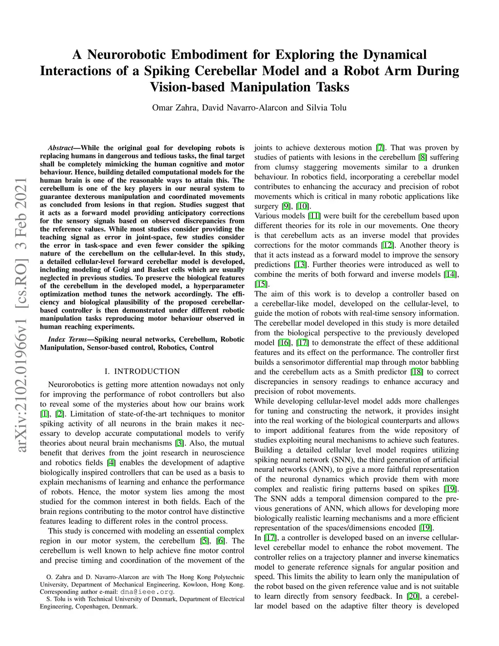 Spiking Cerebellar Model and a Robot Arm During Vision-based Manipulation