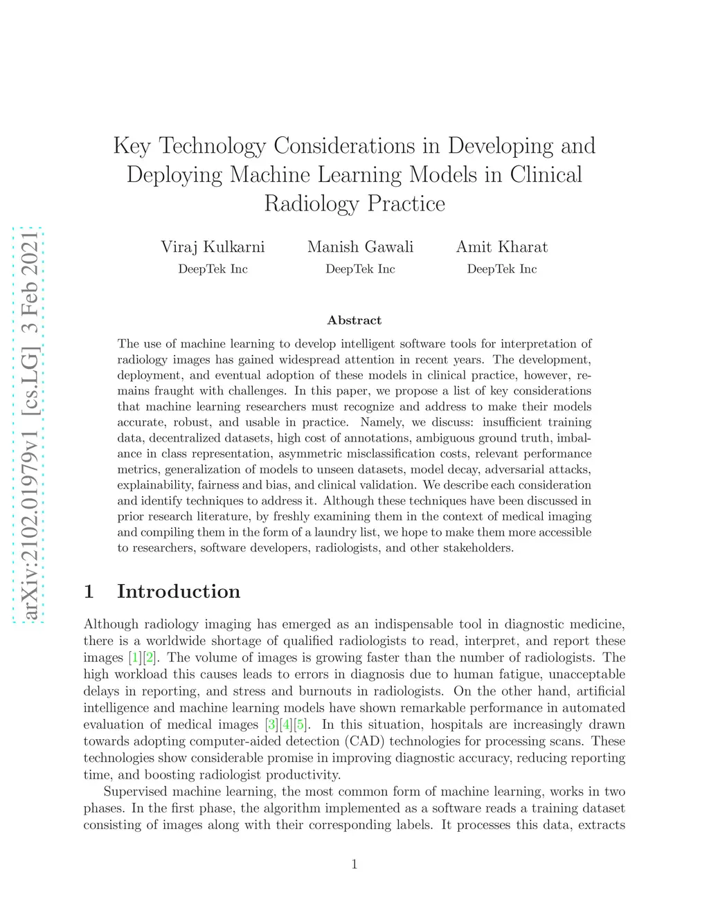 The use of machine learning to develop intelligent software tools for interpretation of radiology images has gained widespread attention in recent years. The development, deployment, and eventual adoption of these models in clinical practice, however, remains fraught with challenges. In this paper, we propose a list of key considerations that machine learning researchers must recognize and address to make their models accurate, robust, and usable in practice. Namely, we discuss: insufficient training data, decentralized datasets, high cost of annotations, ambiguous ground truth, imbalance in class representation, asymmetric misclassification costs, relevant performance metrics, generalization of models to unseen datasets, model decay, adversarial attacks, explainability, fairness and bias, and clinical validation. We describe each consideration and identify techniques to address it. Although these techniques have been discussed in prior research literature, by freshly examining them in the context of medical imaging and compiling them in the form of a laundry list, we hope to make them more accessible to researchers, software developers, radiologists, and other stakeholders.