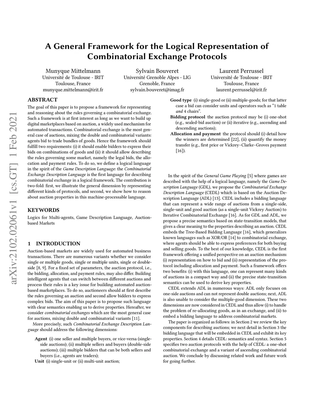 The goal of this paper is to propose a framework for representing and reasoning about the rules governing a combinatorial exchange. Such a framework is at first interest as long as we want to build up digital marketplaces based on auction, a widely used mechanism for automated transactions. Combinatorial exchange is the most general case of auctions, mixing the double and combinatorial variants: agents bid to trade bundles of goods. Hence the framework should fulfill two requirements: (i) it should enable bidders to express their bids on combinations of goods and (ii) it should allow describing the rules governing some market, namely the legal bids, the allocation and payment rules. To do so, we define a logical language in the spirit of the Game Description Language: the Combinatorial Exchange Description Language is the first language for describing combinatorial exchange in a logical framework. The contribution is two-fold: first, we illustrate the general dimension by representing different kinds of protocols, and second, we show how to reason about auction properties in this machine-processable language.