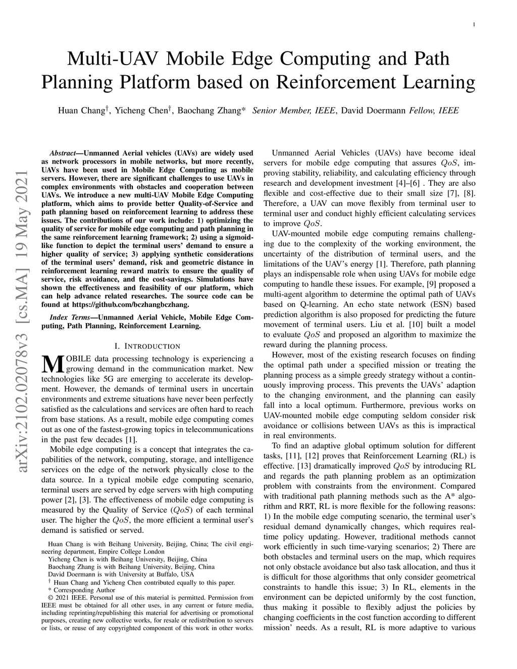 Unmanned Aerial vehicles (UAVs) are widely used as network processors in mobile networks, but more recently, UAVs have been used in Mobile Edge Computing as mobile servers. However, there are significant challenges to use UAVs in complex environments with obstacles and cooperation between UAVs. We introduce a new multi-UAV Mobile Edge Computing platform, which aims to provide better Quality-of-Service and path planning based on reinforcement learning to address these issues. The contributions of our work include: 1) optimizing the quality of service for mobile edge computing and path planning in the same reinforcement learning framework; 2) using a sigmoid-like function to depict the terminal users' demand to ensure a higher quality of service; 3) applying synthetic considerations of the terminal users' demand, risk and geometric distance in reinforcement learning reward matrix to ensure the quality of service, risk avoidance, and the cost-savings. Simulations have shown the effectiveness and feasibility of our platform, which can help advance related researches.
