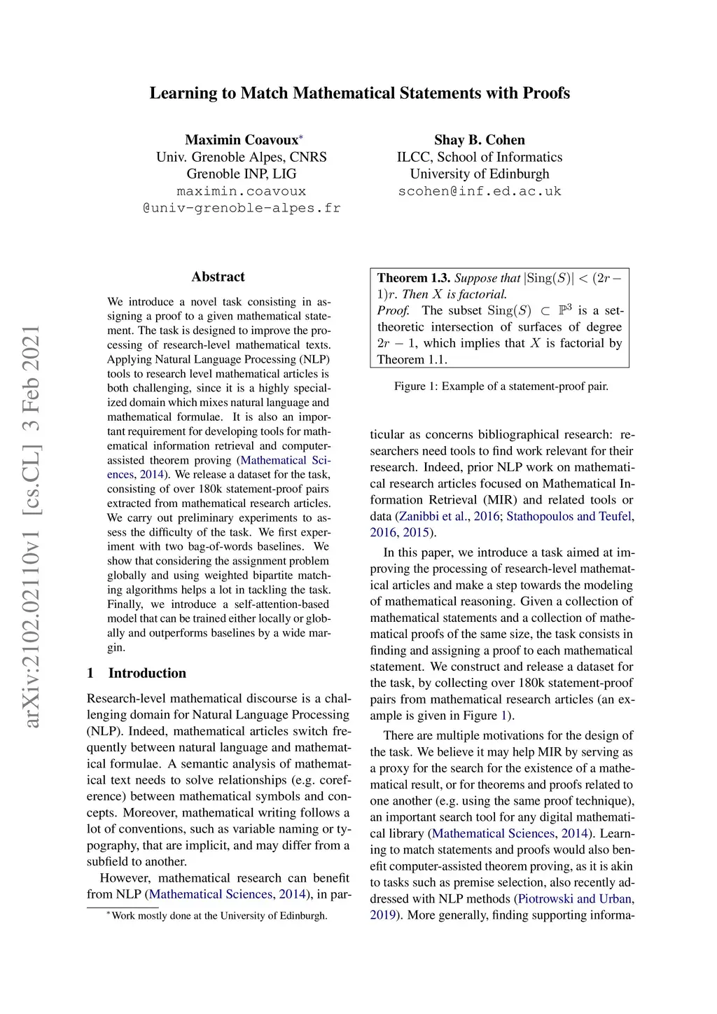 We introduce a novel task consisting in assigning a proof to a given mathematical statement. The task is designed to improve the processing of research-level mathematical texts. Applying Natural Language Processing (NLP) tools to research level mathematical articles is both challenging, since it is a highly specialized domain which mixes natural language and mathematical formulae. It is also an important requirement for developing tools for mathematical information retrieval and computer-assisted theorem proving. We release a dataset for the task, consisting of over 180k statement-proof pairs extracted from mathematical research articles. We carry out preliminary experiments to assess the difficulty of the task. We first experiment with two bag-of-words baselines. We show that considering the assignment problem globally and using weighted bipartite matching algorithms helps a lot in tackling the task. Finally, we introduce a self-attention-based model that can be trained either locally or globally and outperforms baselines by a wide margin.