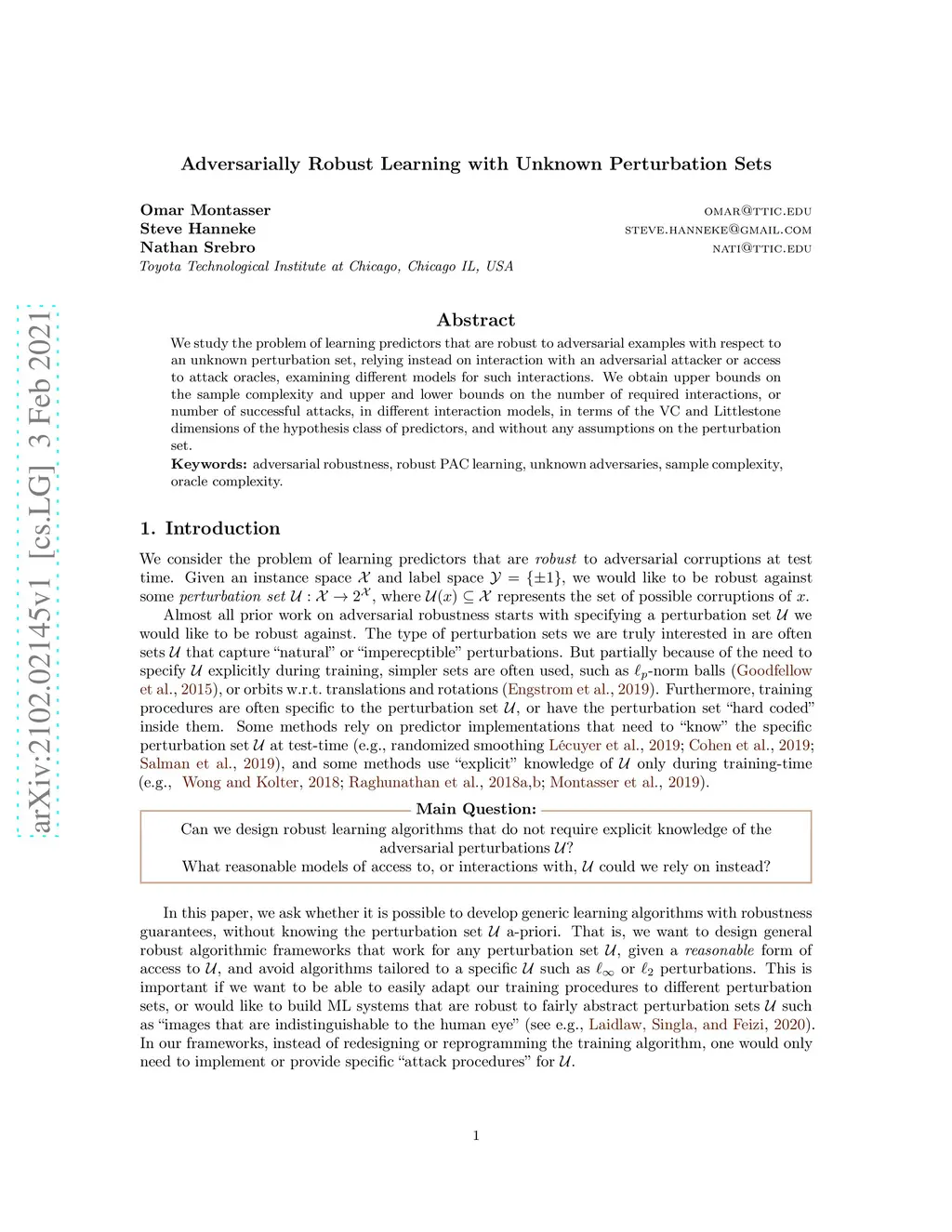 We study the problem of learning predictors that are robust to adversarial examples with respect to an unknown perturbation set, relying instead on interaction with an adversarial attacker or access to attack oracles, examining different models for such interactions. We obtain upper bounds on the sample complexity and upper and lower bounds on the number of required interactions, or number of successful attacks, in different interaction models, in terms of the VC and Littlestone dimensions of the hypothesis class of predictors, and without any assumptions on the perturbation set.