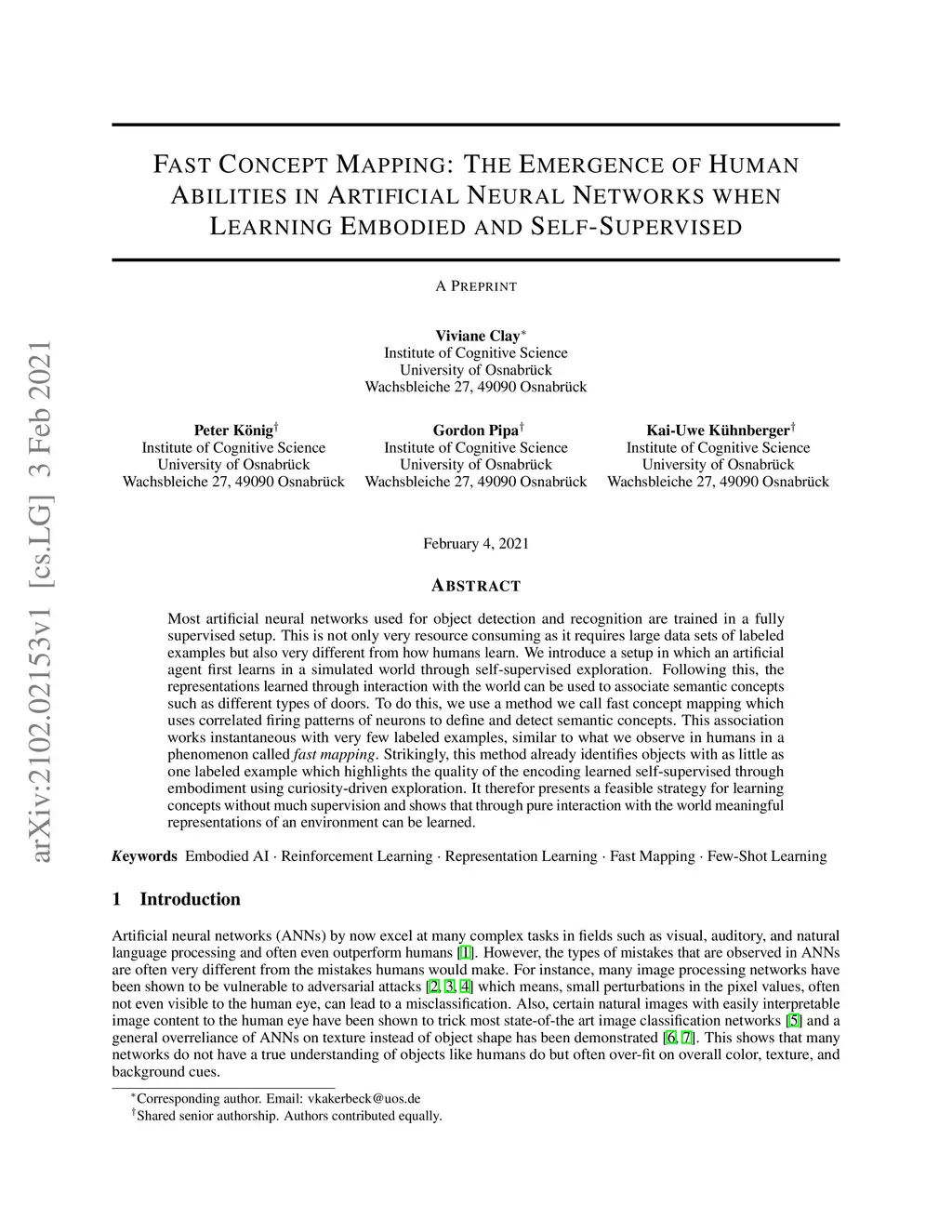 Most artificial neural networks used for object detection and recognition are trained in a fully supervised setup. This is not only very resource consuming as it requires large data sets of labeled examples but also very different from how humans learn. We introduce a setup in which an artificial agent first learns in a simulated world through self-supervised exploration. Following this, the representations learned through interaction with the world can be used to associate semantic concepts such as different types of doors. To do this, we use a method we call fast concept mapping which uses correlated firing patterns of neurons to define and detect semantic concepts. This association works instantaneous with very few labeled examples, similar to what we observe in humans in a phenomenon called fast mapping. Strikingly, this method already identifies objects with as little as one labeled example which highlights the quality of the encoding learned self-supervised through embodiment using curiosity-driven exploration. It therefor presents a feasible strategy for learning concepts without much supervision and shows that through pure interaction with the world meaningful representations of an environment can be learned.