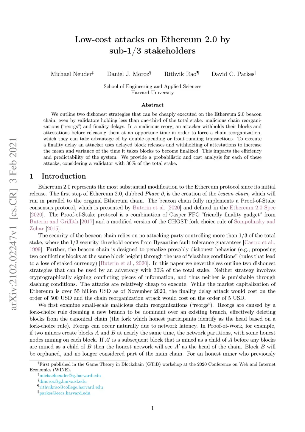 Low-cost attacks on Ethereum 2.0 by sub-1/3 stakeholders