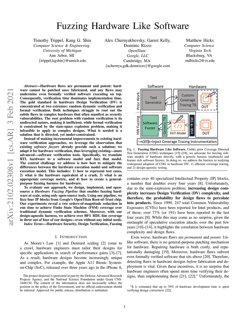 Hardware flaws are permanent and potent: hardware cannot be patched once fabricated, and any flaws may undermine any software executing on top. Consequently, verification time dominates implementation time. The gold standard in hardware Design Verification (DV) is concentrated at two extremes: random dynamic verification and formal verification. Both struggle to root out the subtle flaws in complex hardware that often manifest as security vulnerabilities. The root problem with random verification is its undirected nature, making it inefficient, while formal verification is constrained by the state-space explosion problem, making it infeasible against complex designs. What is needed is a solution that is directed, yet under-constrained. Instead of making incremental improvements to existing DV approaches, we leverage the observation that existing software fuzzers already provide such a solution, and adapt them for hardware DV. Specifically, we translate RTL hardware to a software model and fuzz that model. The central challenge we address is how best to mitigate the differences between the hardware execution model and software execution model. This includes: 1) how to represent test cases, 2) what is the hardware equivalent of a crash, 3) what is an appropriate coverage metric, and 4) how to create a general-purpose fuzzing harness for hardware. To evaluate our approach, we fuzz four IP blocks from Google's OpenTitan SoC. Our experiments reveal a two orders-of-magnitude reduction in run time to achieve Finite State Machine (FSM) coverage over traditional dynamic verification schemes. Moreover, with our design-agnostic harness, we achieve over 88% HDL line coverage in three out of four of our designs -- even without any initial seeds.
