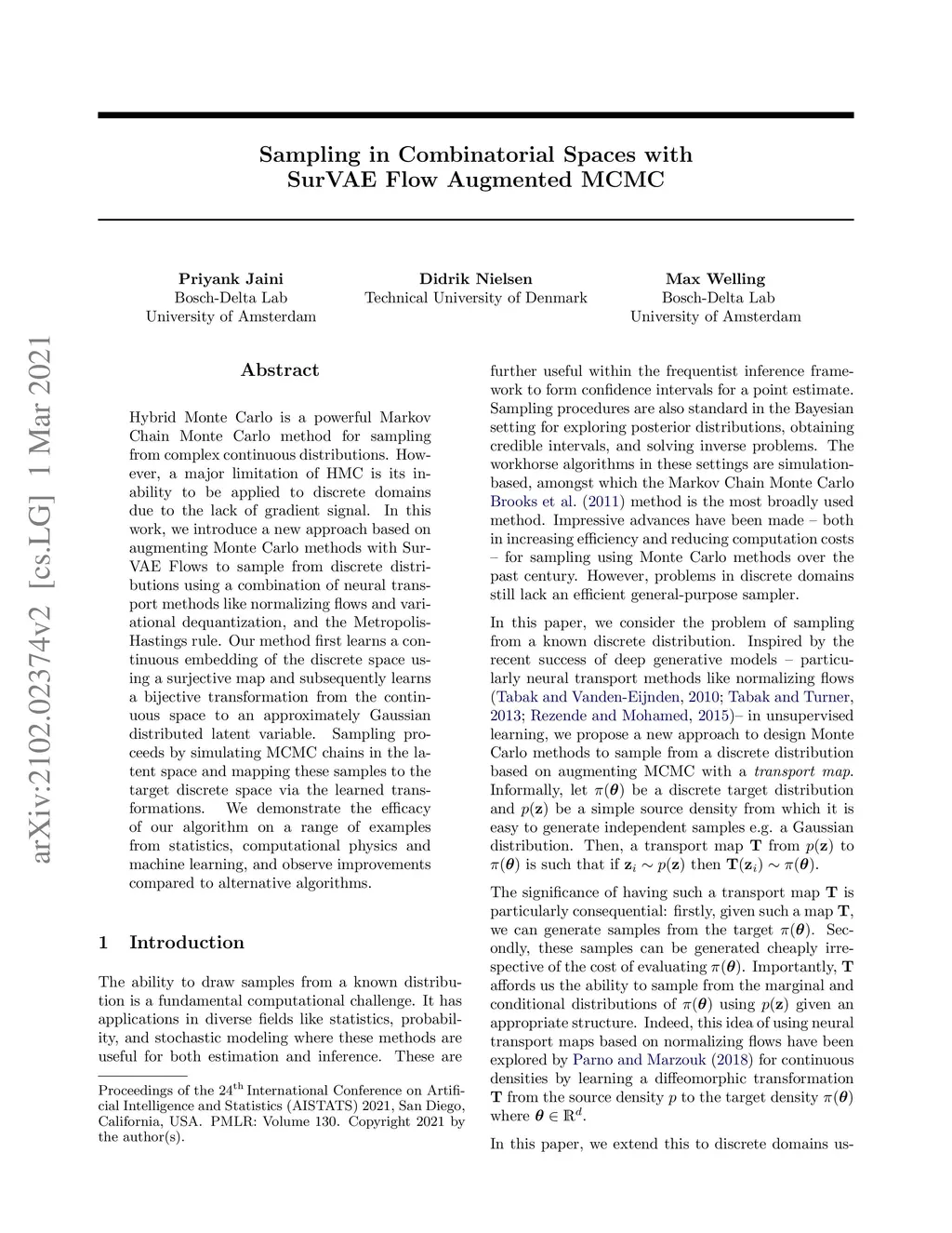 Hybrid Monte Carlo is a powerful Markov Chain Monte Carlo method for sampling from complex continuous distributions. However, a major limitation of HMC is its inability to be applied to discrete domains due to the lack of gradient signal. In this work, we introduce a new approach based on augmenting Monte Carlo methods with SurVAE Flows to sample from discrete distributions using a combination of neural transport methods like normalizing flows and variational dequantization, and the Metropolis-Hastings rule. Our method first learns a continuous embedding of the discrete space using a surjective map and subsequently learns a bijective transformation from the continuous space to an approximately Gaussian distributed latent variable. Sampling proceeds by simulating MCMC chains in the latent space and mapping these samples to the target discrete space via the learned transformations. We demonstrate the efficacy of our algorithm on a range of examples from statistics, computational physics and machine learning, and observe improvements compared to alternative algorithms.